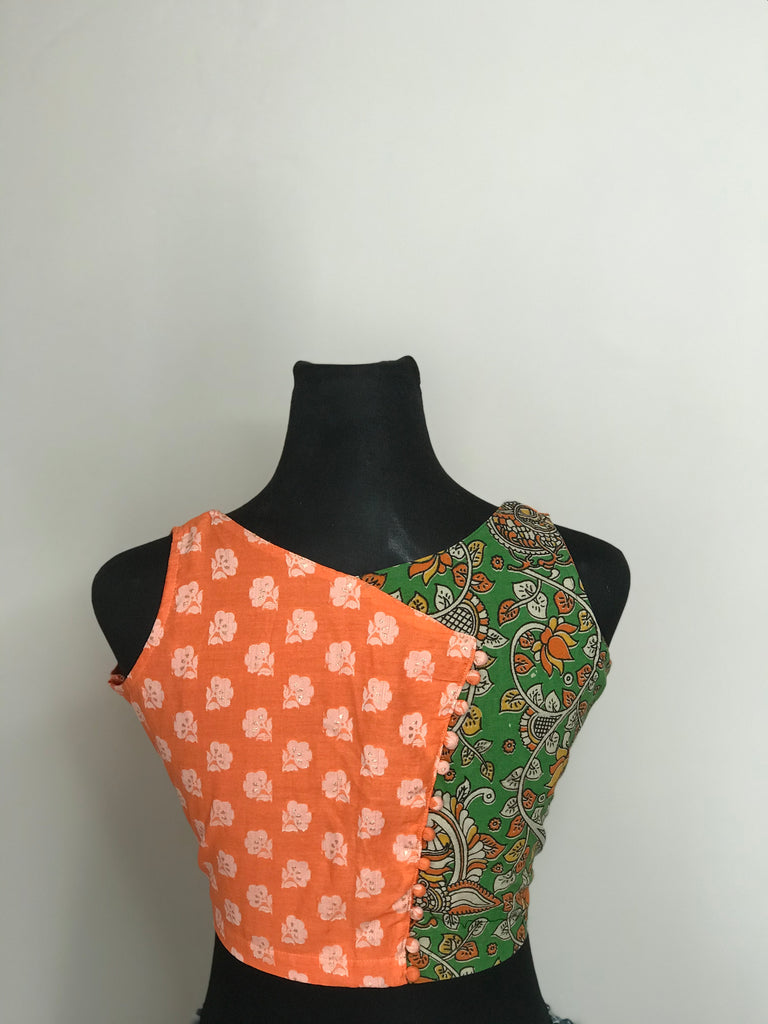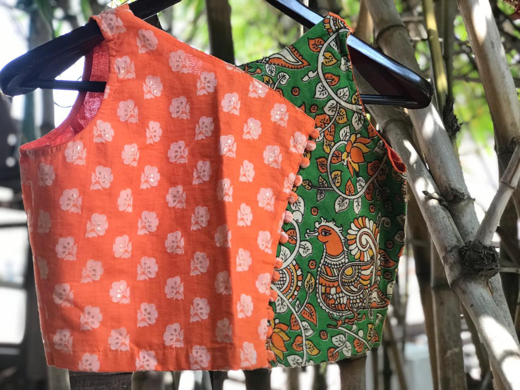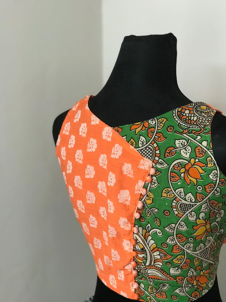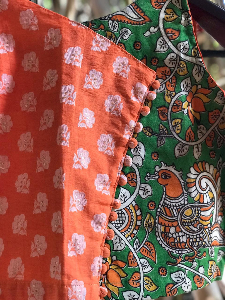 Orange Mist – Beautiful carrot Orange Cotton with white floral motifs all over detailed with a Green kalamkari Flapembedded with potli buttons easy and breezy for all type of occassions.