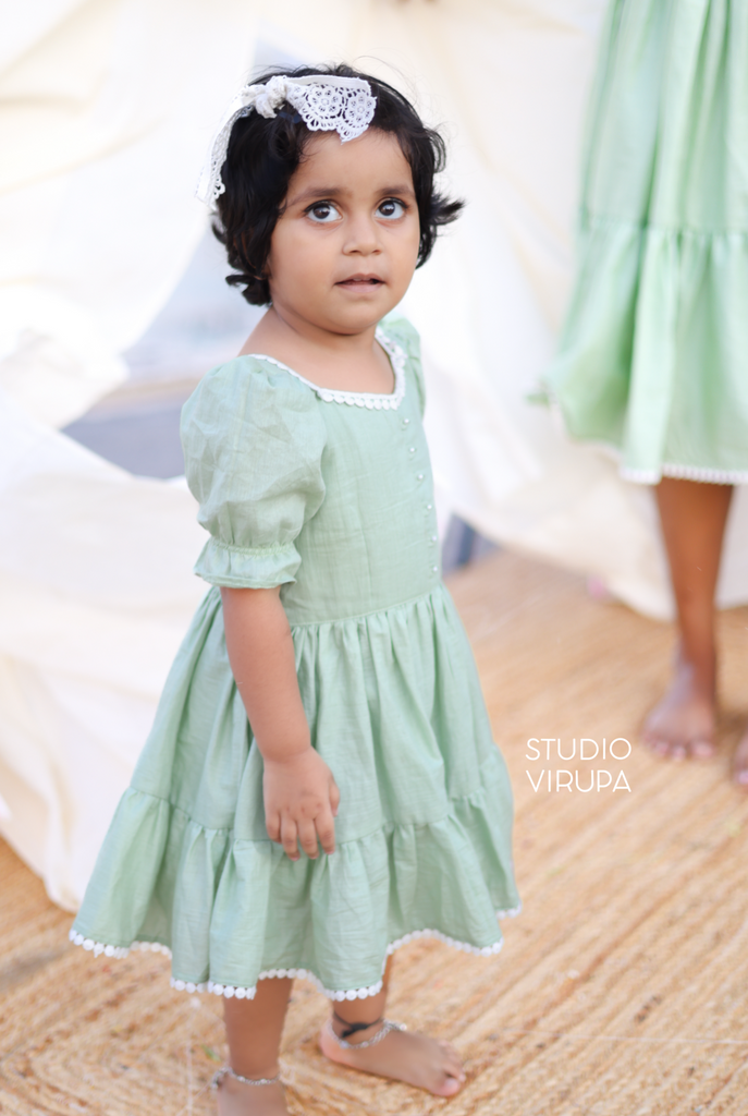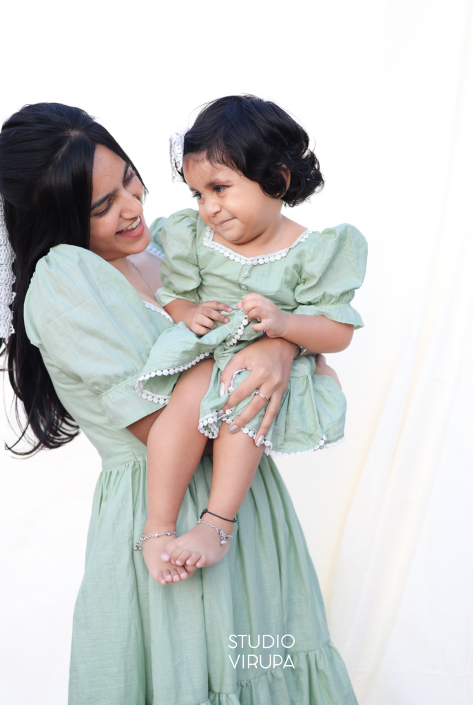 Mom and daughter matching frocks in our charming Gulabi collection! Made with 100% pure cotton and adorned with delicate white lace, these frocks are perfect for twinning with your little one. Elevate your matching game with this elegant and comfortable duo.