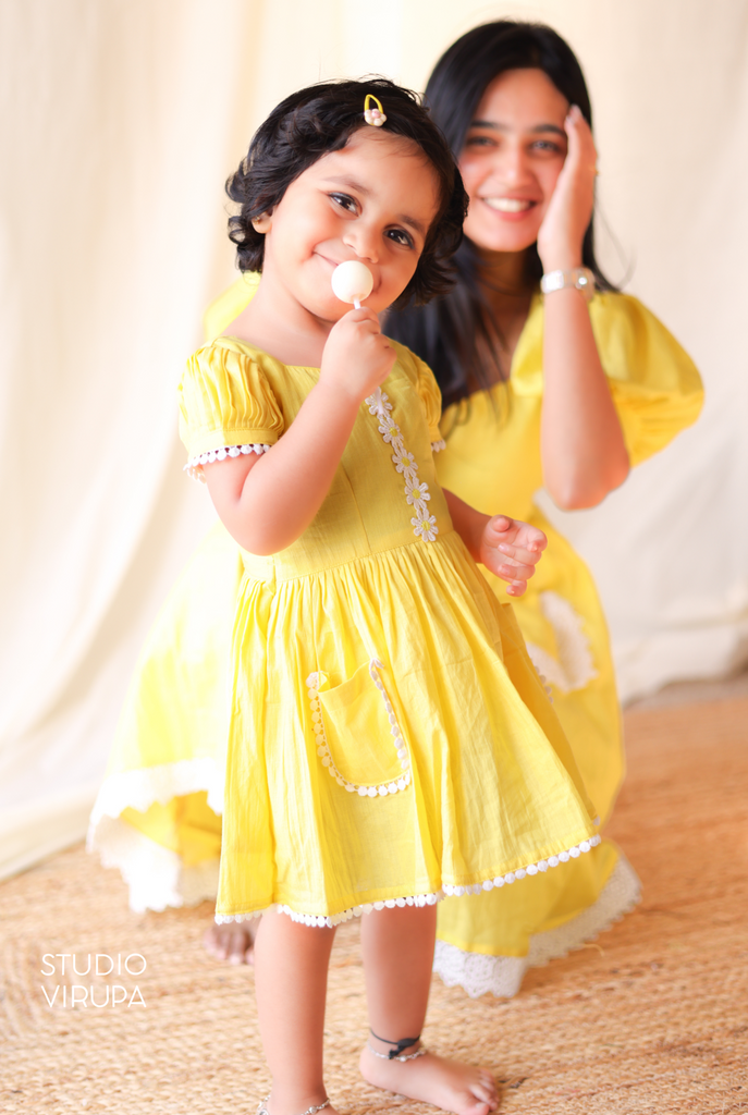 Mom and daughter matching frocks in our charming Gulabi collection! Made with 100% pure cotton and adorned with delicate white lace, these frocks are perfect for twinning with your little one. Elevate your matching game with this elegant and comfortable duo.