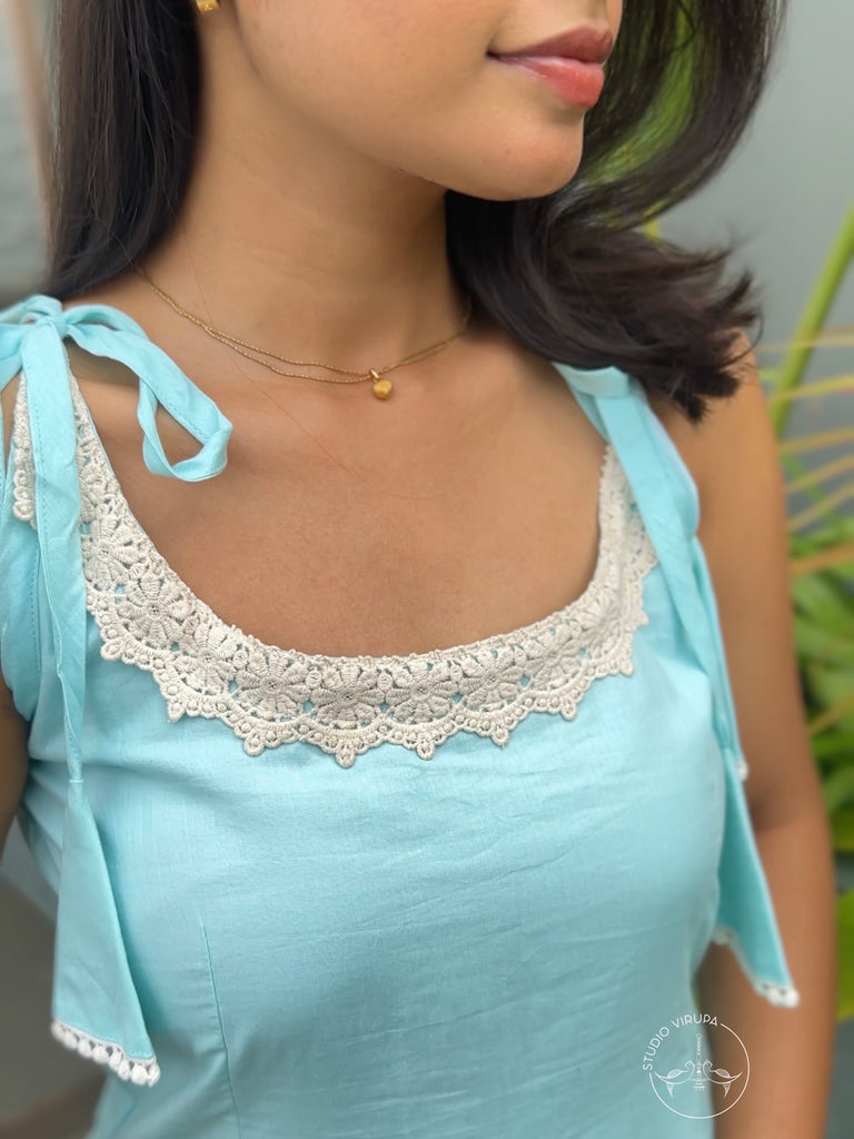 Pastel blue daily wear strappy kurtha with lace detailings