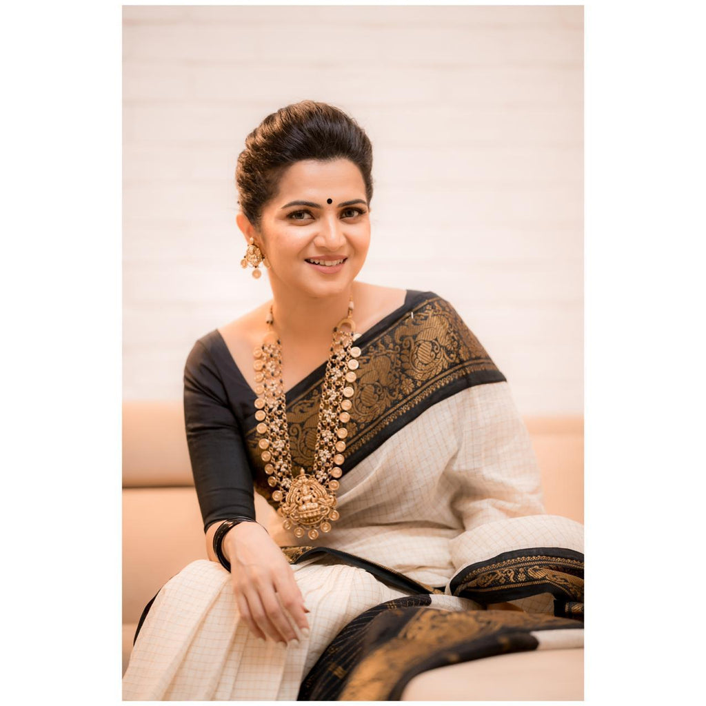 Our Traditional pure Cotton Madurai Sungudi in a Stunning shade of Half White with Gold Checks body and Black Zari detailed Border and Pallu, such a classy combo.