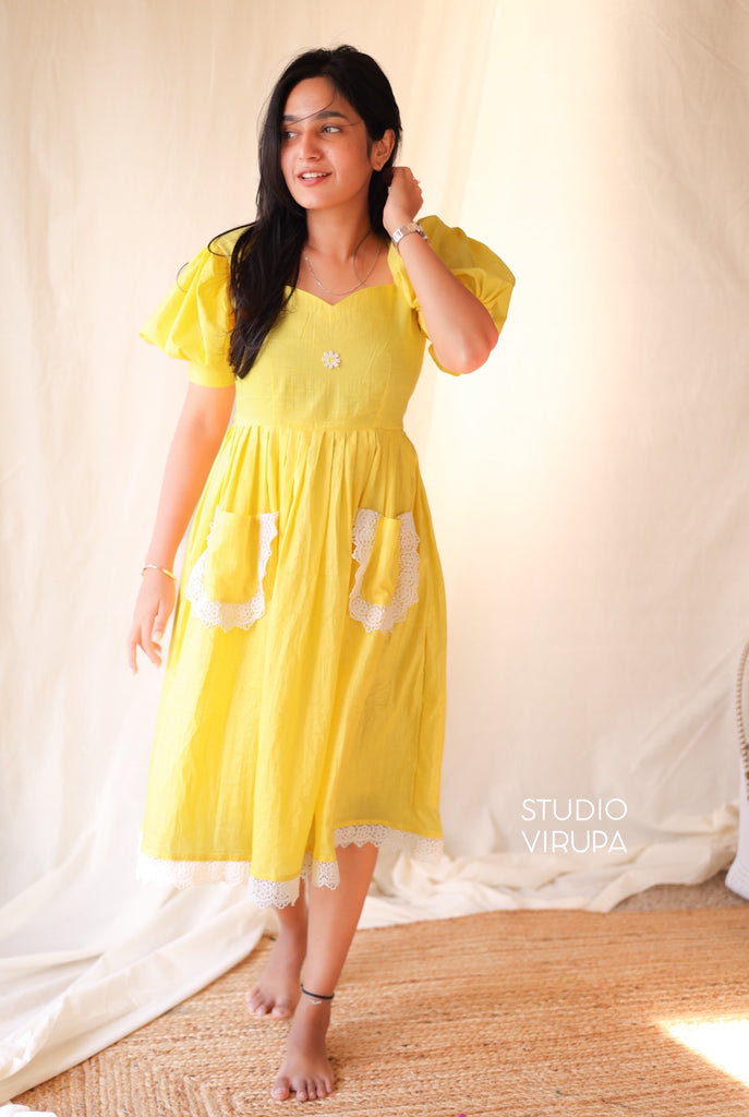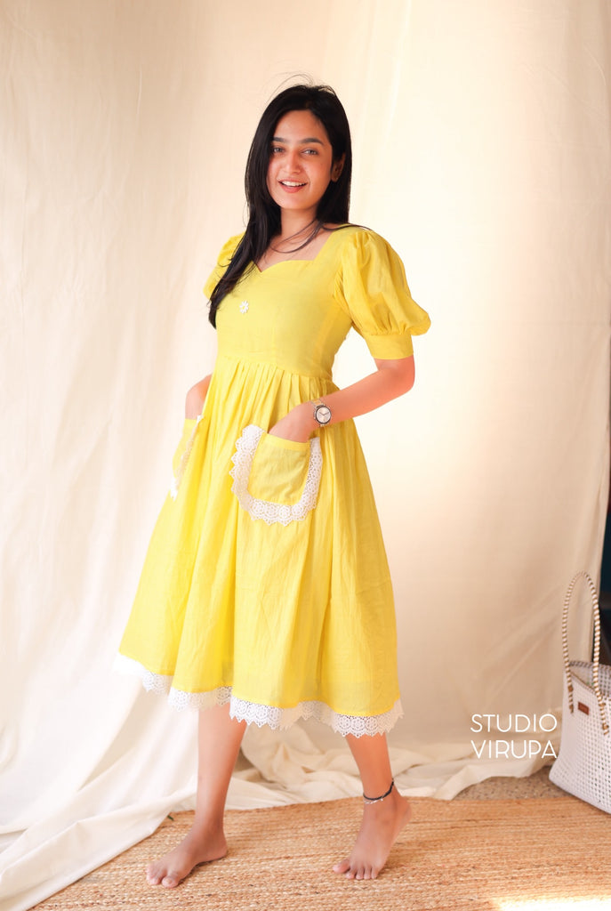 Elevate your everyday style with our Gulabi dress in Yellow! Made with pure cotton, it's perfect for daily wear. The delicate white lace adds a touch of elegance, making you stand out in the crowd. Indulge in comfort without compromising on style!