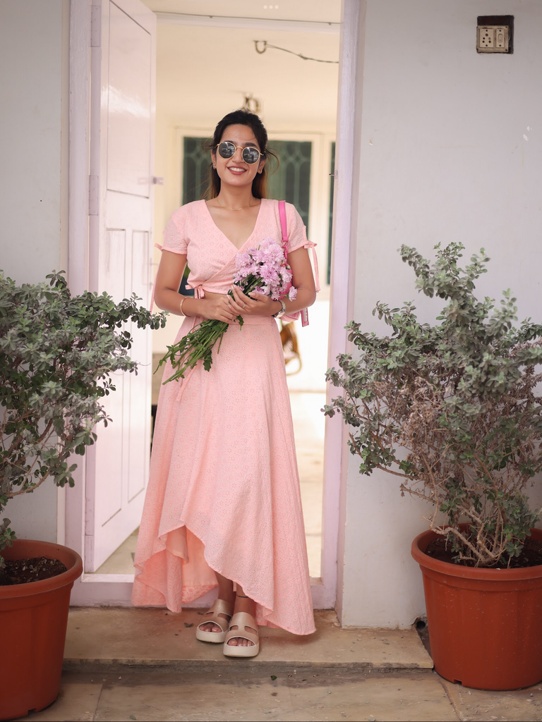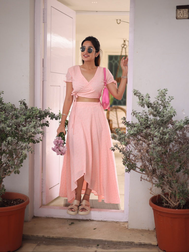 Effortlessly stylish, this Hakoba crop top and skirt set blends traditional charm with a contemporary silhouette. The crop top features an Angarkha-style wrap design with a flattering V-neckline and shirt sleeves finished with playful knot ties, adding a touch of detail and versatility.