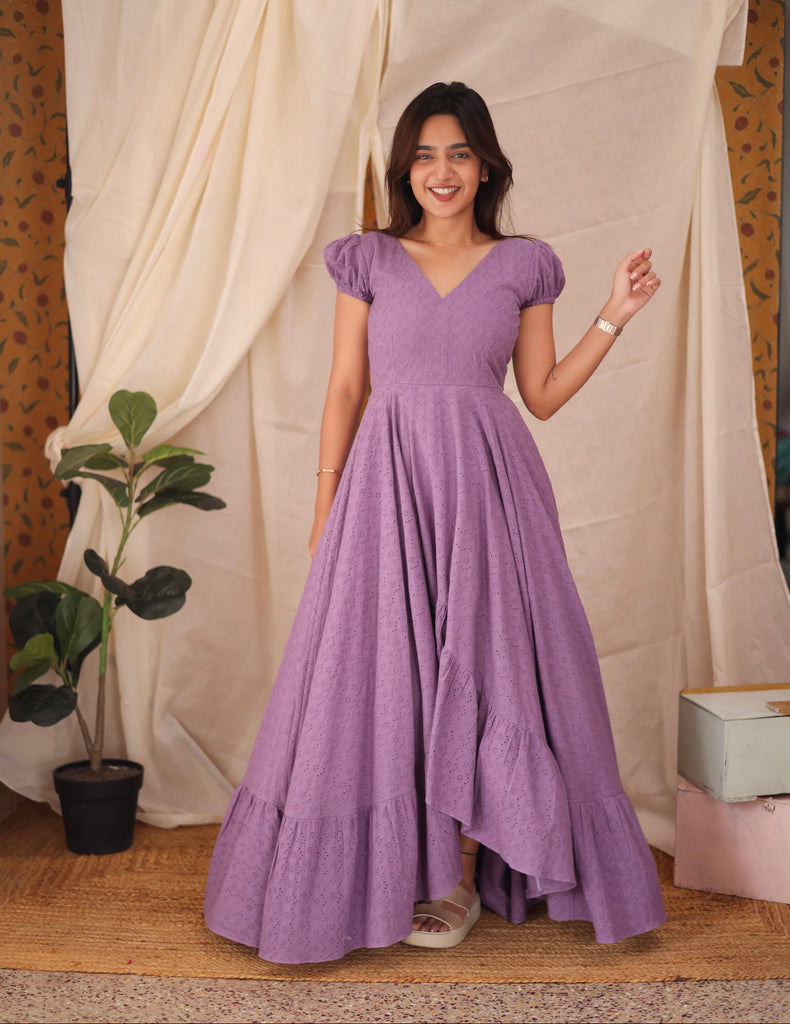 A blend of charm and contemporary design, this Hakoba cotton dress features a stylish asymmetrical hemline for a fluid, modern silhouette. The delicate Hakoba embroidery showcases tiny floral and dot patterns, adding soft texture and detail to the look.