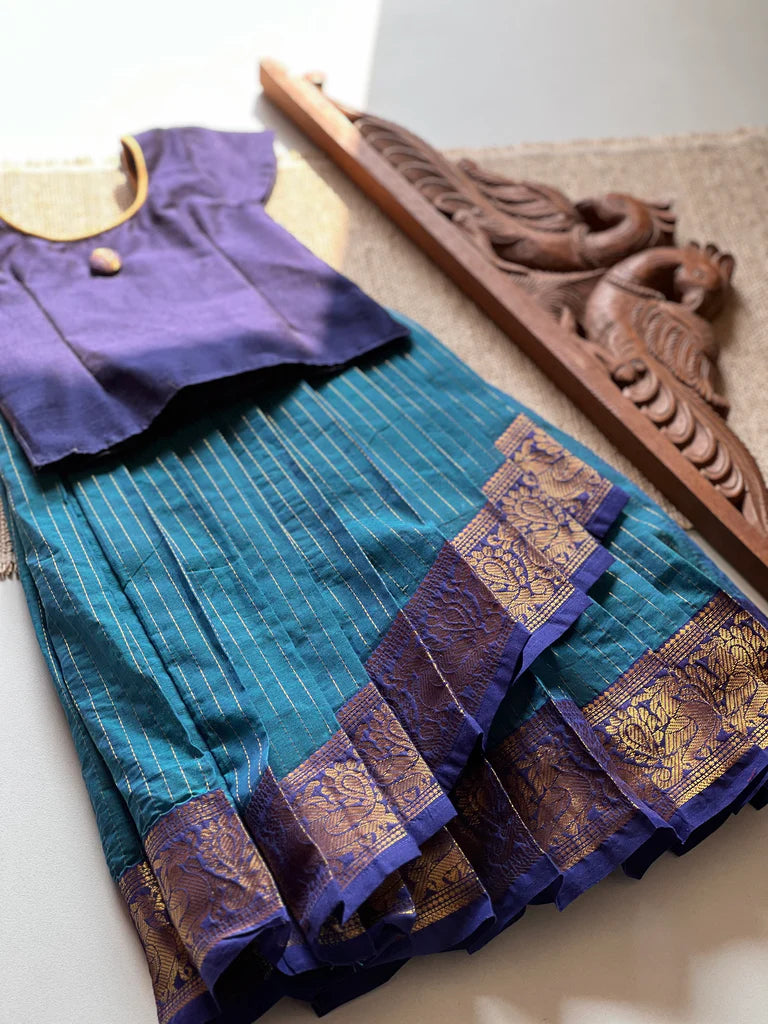 Overlapped skirt with bodice and top is part of our festive collection for kids. Made from Chettinad cotton and raw silk ,it is perfect for celebrating Festivals with its traditional and vibrant design. Elevate your child's style and cultural experience with this unique piece.