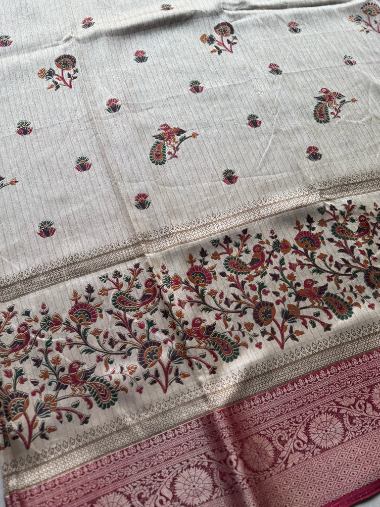 This elegant Ivory Banarasi Silk Saree beautifully blends traditional weaving with artistic detailing. The soft ivory body is enhanced with subtle zari stripes running across the saree, giving it a graceful texture. Scattered across the body are intricate peacock buttas, symbolizing prosperity and heritage, adding a regal charm to the saree.
