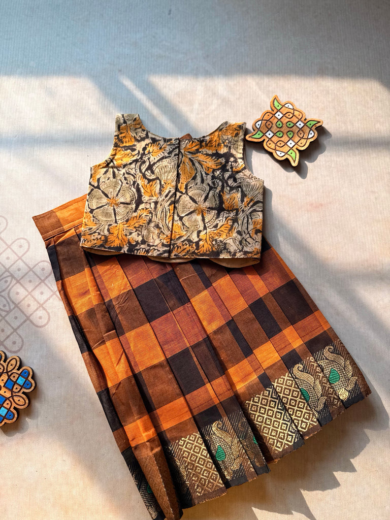 An elegant fusion of tradition and style, this set features a floral kalamkari cotton crop top paired with a Chettinad cotton skirt. The top is beautifully styled with a roundneck that adds a festive charm, while the sleeveless cut keeps it modern and comfortable. The pleated Chettinad skirt is highlighted with a rich golden zari border, completing the look with a touch of heritage grandeur. A perfect choice for festive occasions, weddings, and cultural celebrations.