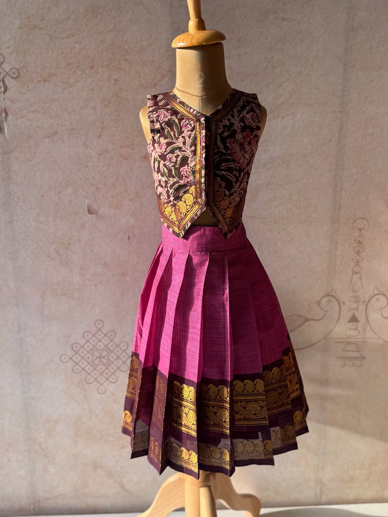 An elegant ethnic ensemble crafted with traditional charm, this set pairs a kalamkari cotton crop top with a pleated Chettinad cotton skirt. The top is designed in rich floral kalamkari patterns, detailed with a front-opening, giving it a unique and stylish finish. Complementing it is a vibrant Chettinad skirt adorned with a broad zari border, adding a festive grandeur. Together, this set beautifully balances comfort, tradition, and style—perfect for special occasions and celebrations.