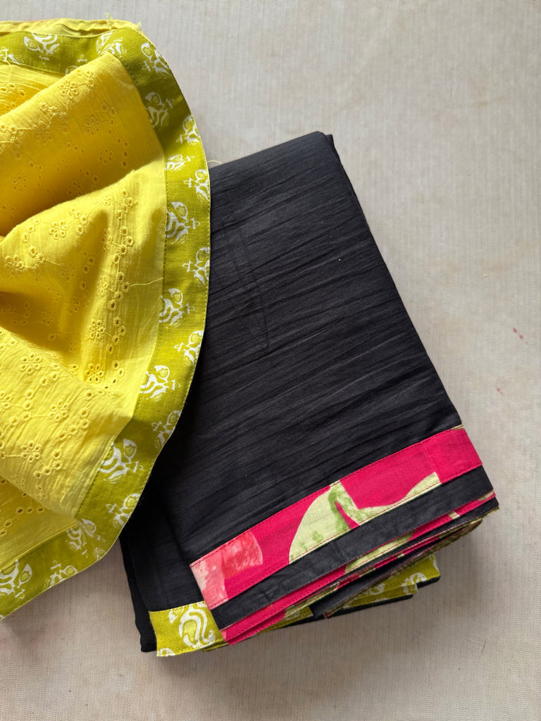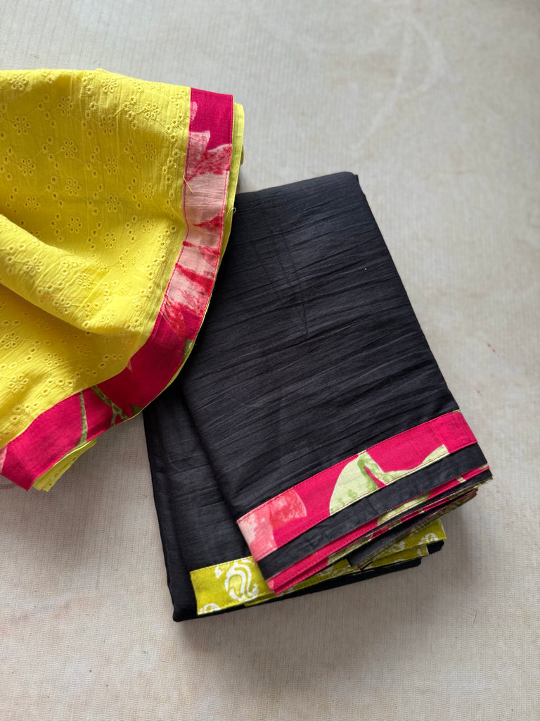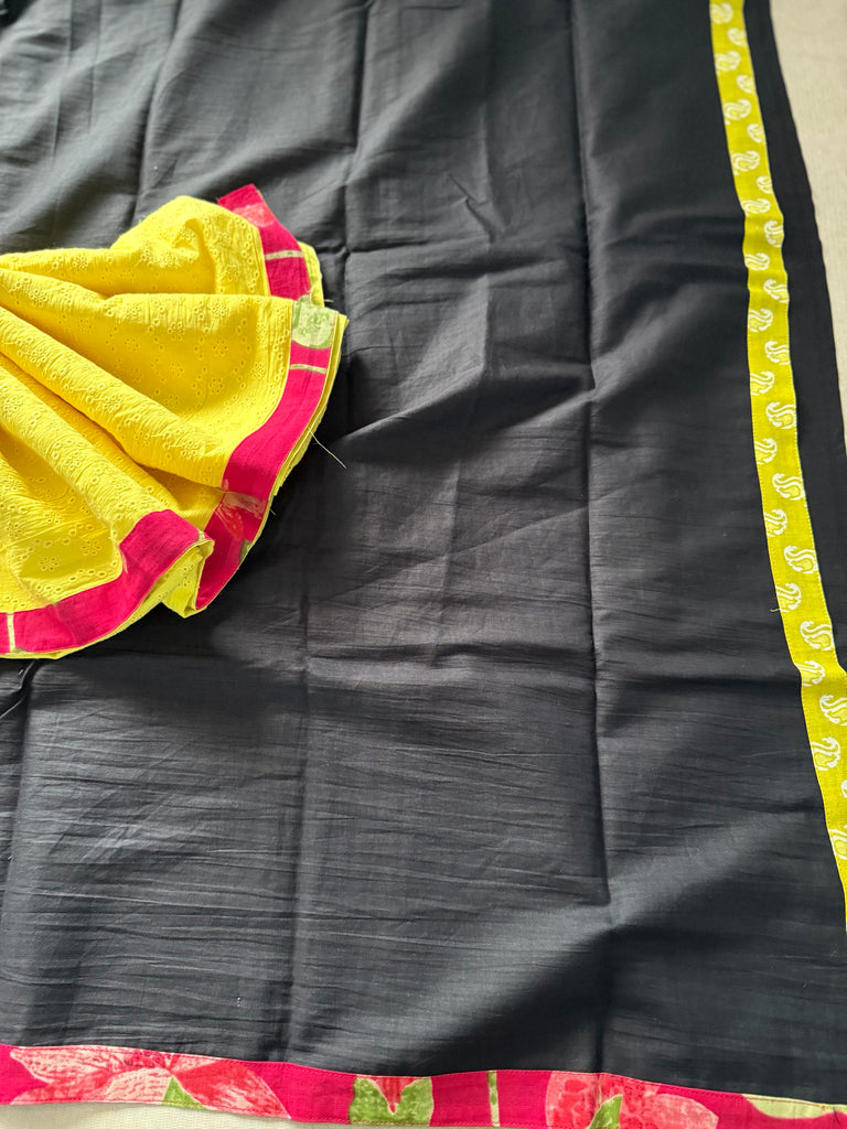 Crafted by skilled artisans at Virupa, Diva is a stunning Pure Cotton saree adorned with intricate sequin embroidery all over. Its soft Cotton fabric showcases expert craftsmanship and is paired with a matching blouse featuring patchwork in both colors.