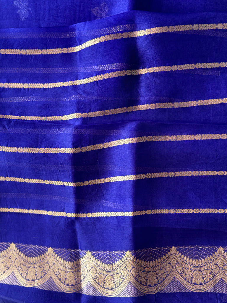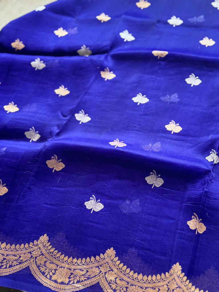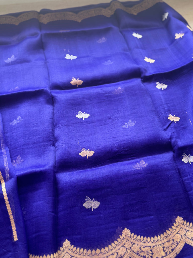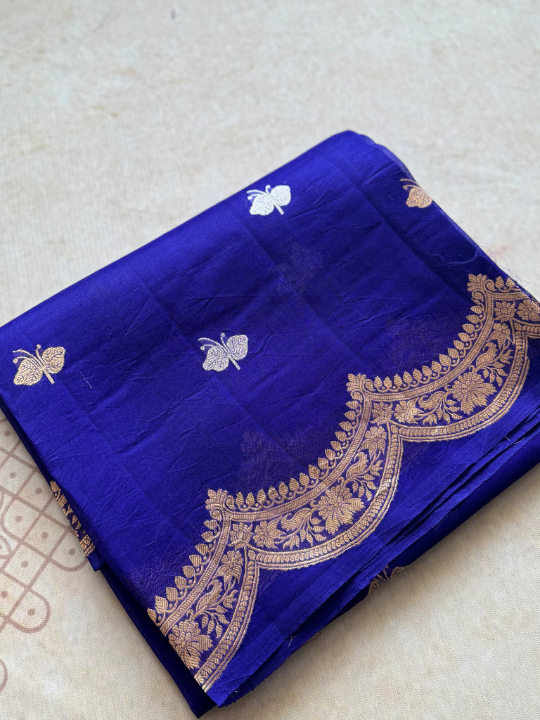 Embrace graceful charm with this rich royal pure organza saree, beautifully adorned with butterfly buttas in sona rupa zari that add a whimsical shimmer to the soft, pastel base. The saree features a rich gold zari border, perfectly complementing the delicate fabric while maintaining a light, weightless feel ideal for all-day elegance.