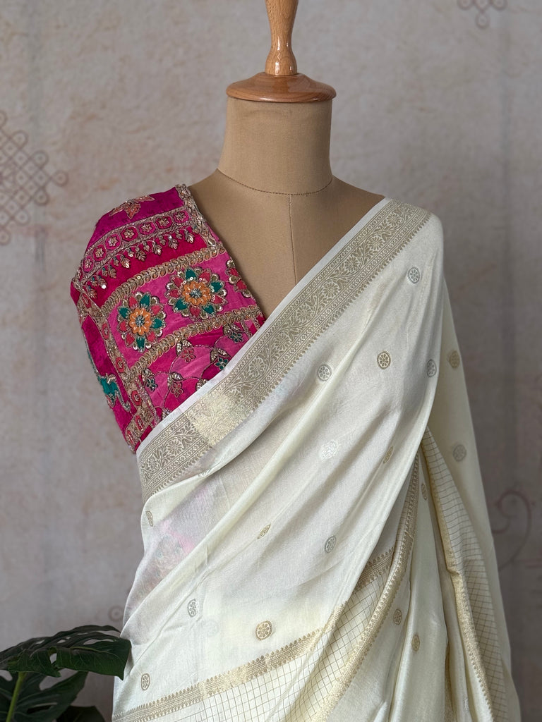 What truly elevates this saree is we matched it with its exclusive contrast Raja Rani blouse, crafted in a rich complementary shade. The blouse fabric is embellished with all-over zari buttas, adding a luxurious finish that perfectly balances the saree’s Mubbagam colour layout. It allows for both traditional and contemporary blouse stitching styles.