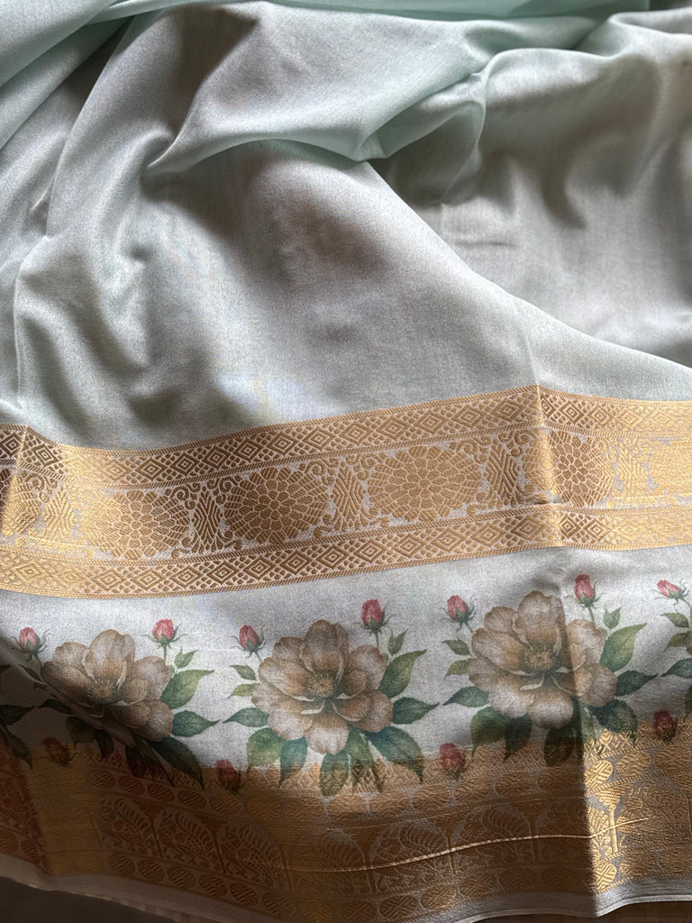 The true charm lies in the delicately woven floral Mubbagam borders, adorned with subtle gold zari detailing that adds a gentle festive glow. Soft floral motifs in soothing tones create a graceful contrast against the solid body, lending the saree a refined and feminine appeal. The pallu is kept minimal, echoing the floral and zari elements for a balanced finish—perfect for women who appreciate understated luxury. Ideal for festive gatherings, intimate celebrations, cultural events, and elegant daytime wear.