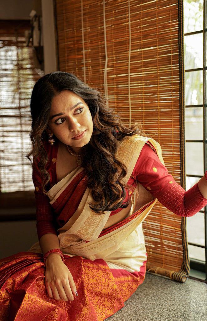 It comes with a one metre blouse fabric designed in a unique 50–50 combination, featuring elegant polka dots on one half and classic zari checks on the other. This thoughtfully balanced design beautifully complements the saree’s rich traditional and festive appeal.