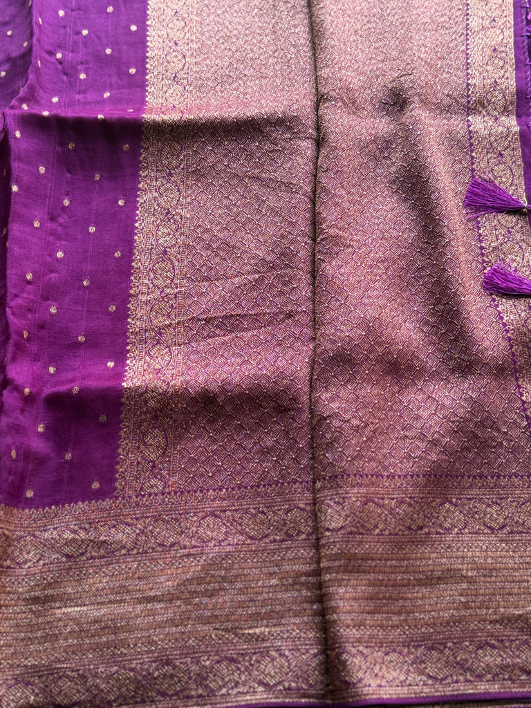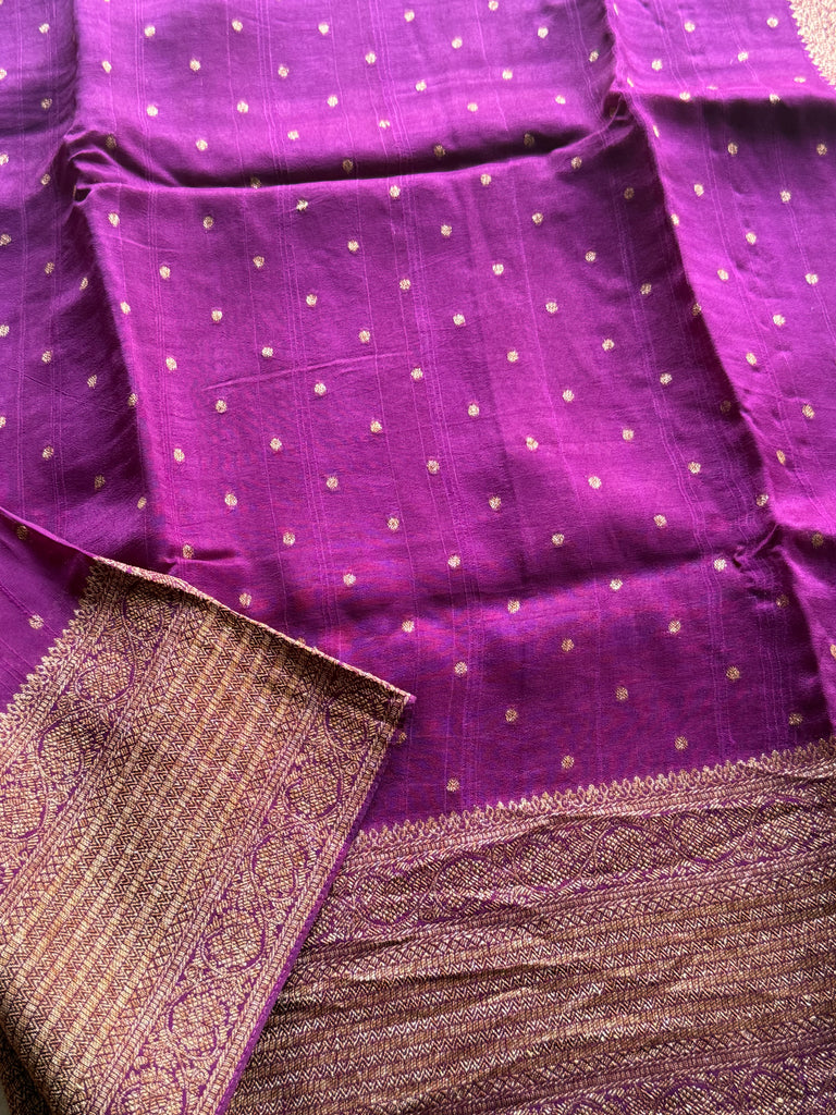 Crafted from pure dupion silk, the saree features a radiant magenta-violet body adorned with delicate gold buttas scattered all over, adding understated elegance and charm. The natural crisp texture of dupion silk enhances its structured drape and subtle sheen.