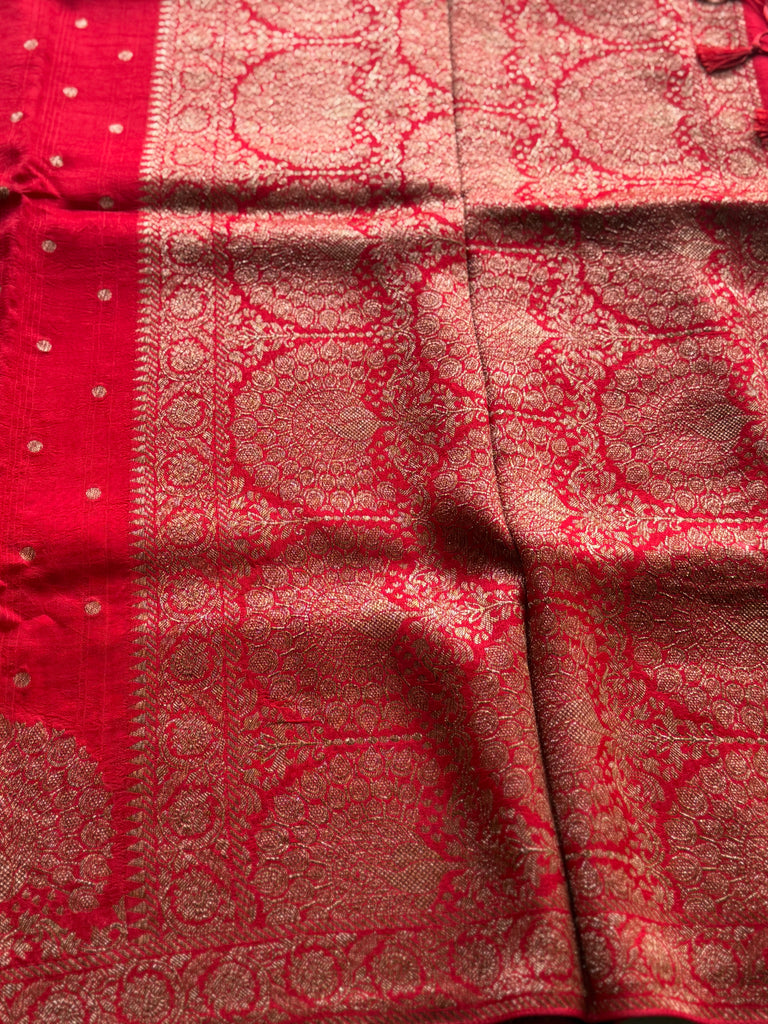 Drape yourself in timeless grandeur with this Exquisite Crepe Silk Saree, crafted in a rich festive red hue and adorned with intricate gold zari artistry. The body features delicate zari buttas scattered elegantly across the saree, adding subtle shimmer and refinement.