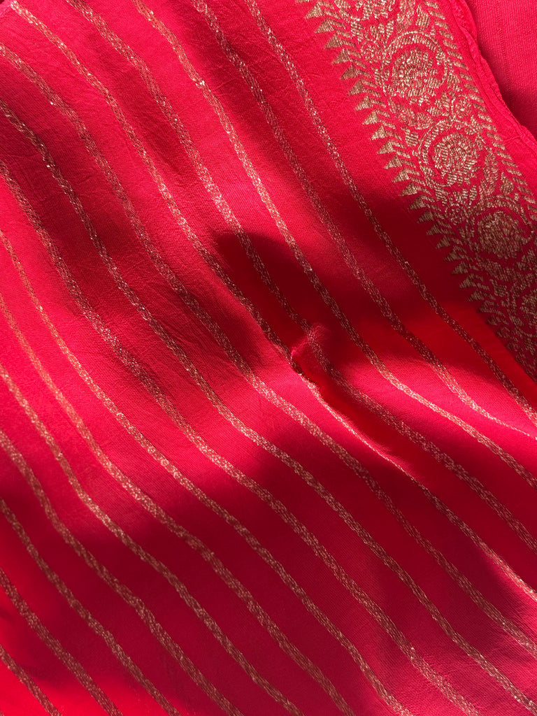 Paired with a matching blouse featuring elegant zari stripes, this ensemble is a complete statement of heritage craftsmanship and modern elegance.