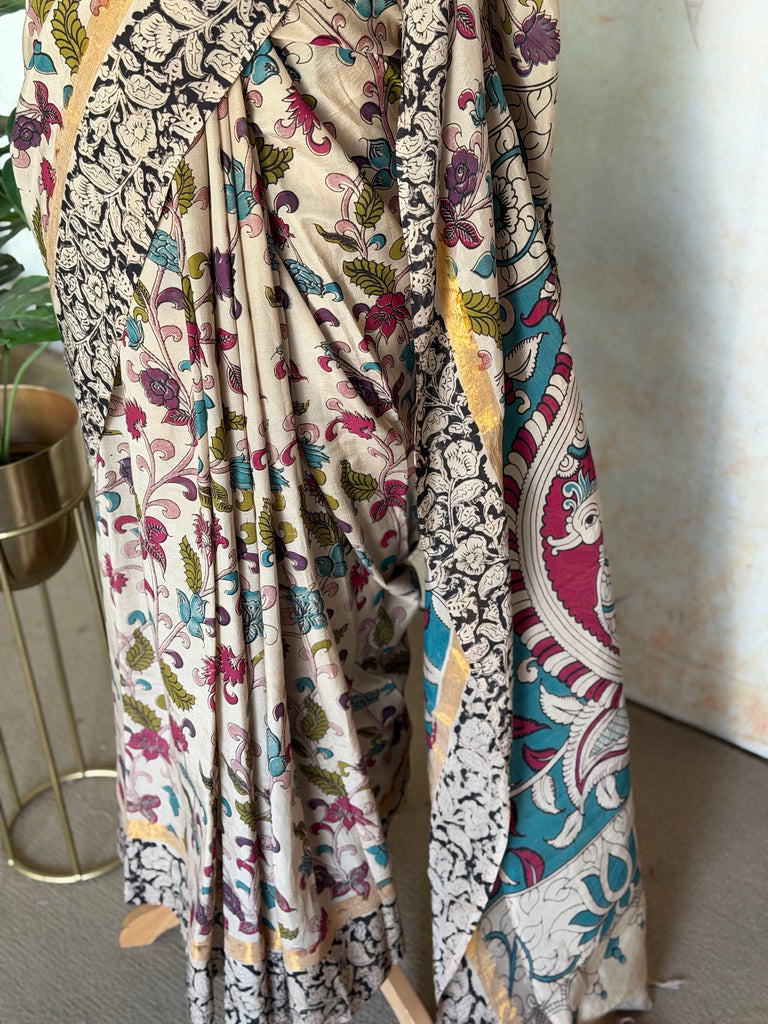 Elevate your ethnic wardrobe with this exquisite Pure Chennuri Silk Kalamkari Saree, a seamless blend of tradition and artistry. The saree features a soft beige base adorned with delicate floral Kalamkari prints scattered gracefully across the body, creating a refined and timeless aesthetic.