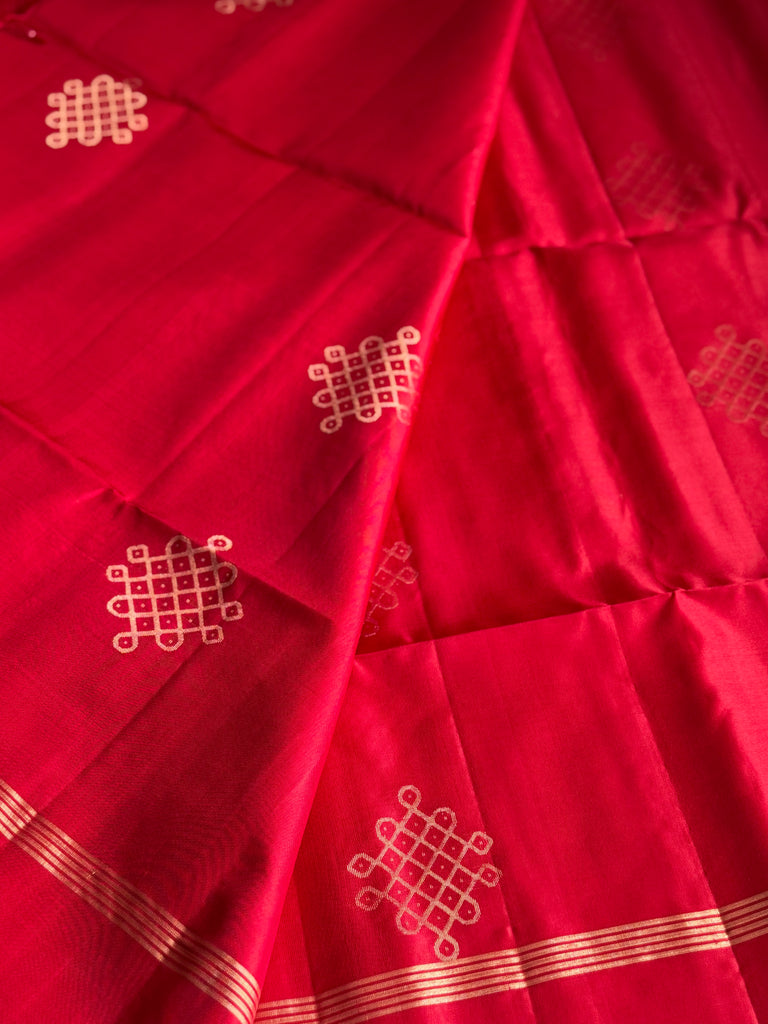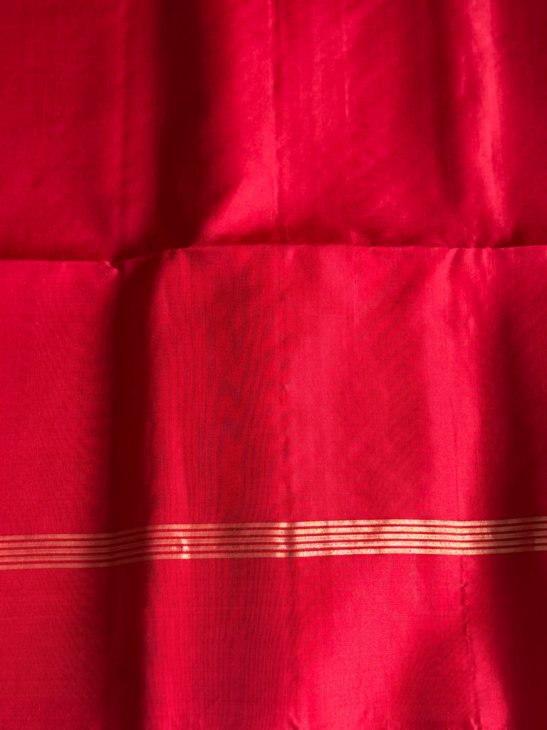 The saree is framed with a subtle zari line border, enriched with classic gold zari, creating a regal contrast against the red silk. The soft silk texture ensures a graceful drape while retaining the authentic weight and sheen Kanjivaram sarees are celebrated for.