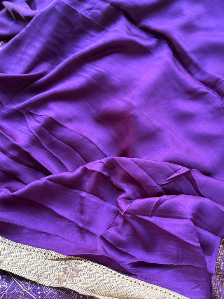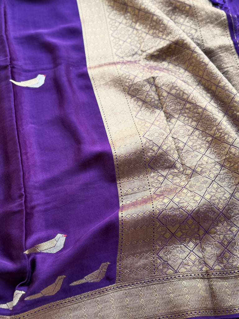 Tags: Crepe Satin Saree, Purple Satin Saree, Bird Motif Saree, Antique Gold Zari Saree, Party Wear Saree, Reception Saree, Festive Saree, Traditional Zari Border Saree, Elegant Evening Saree
