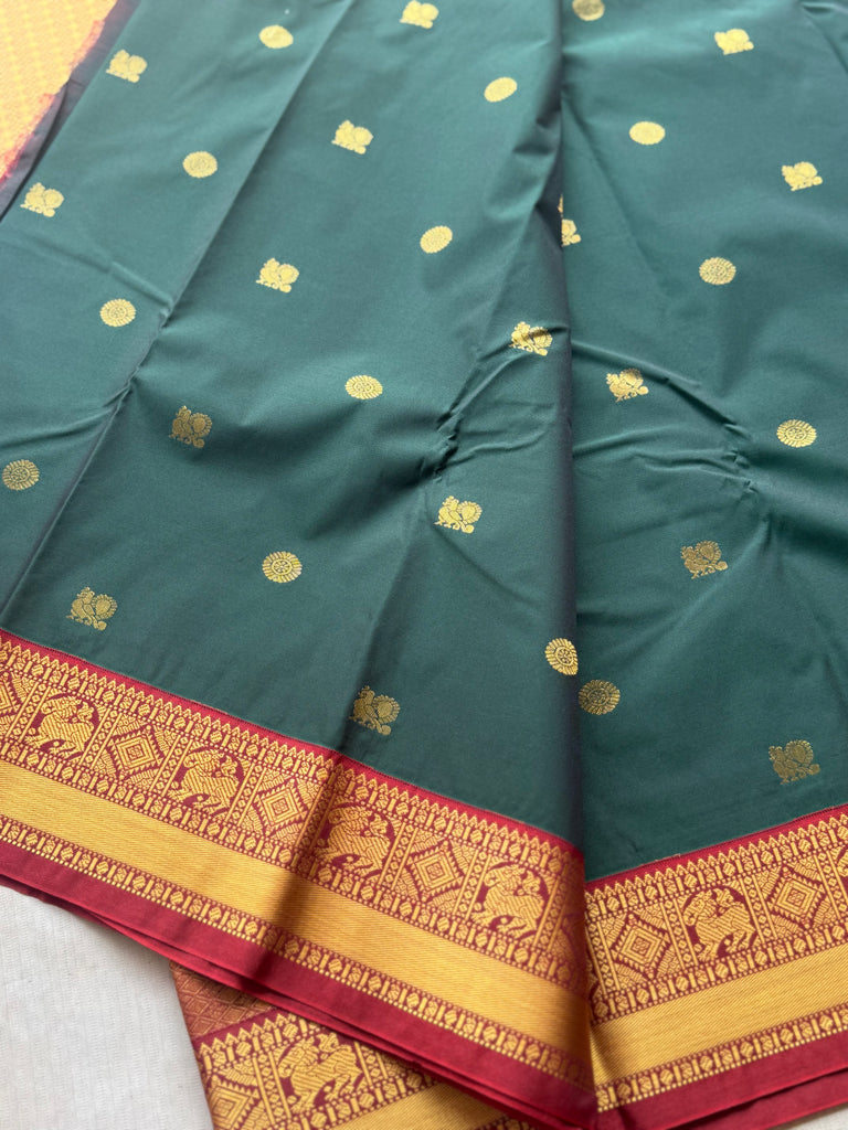 This elegant Semi Kanchipuram Silk Saree showcases a rich vintage teal green body adorned with delicate gold zari peacock and traditional round butta motifs evenly spread across the saree. The subtle yet regal motifs give the saree a timeless South Indian aesthetic, making it perfect for women who appreciate classic elegance with heritage charm.