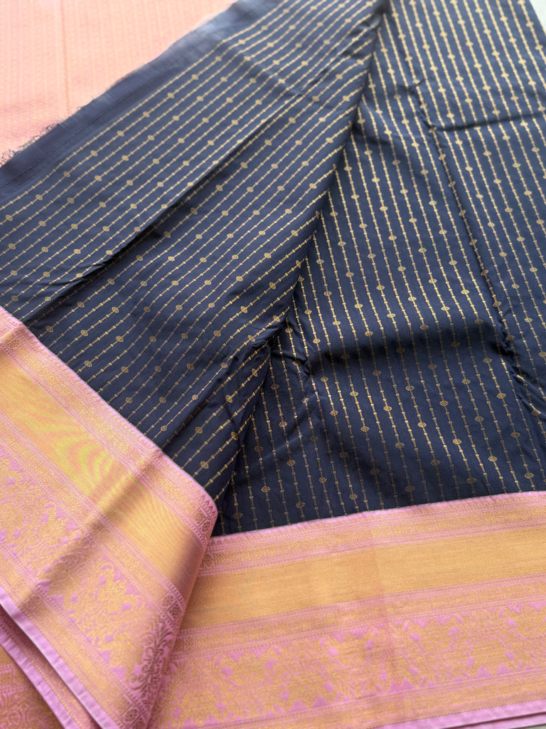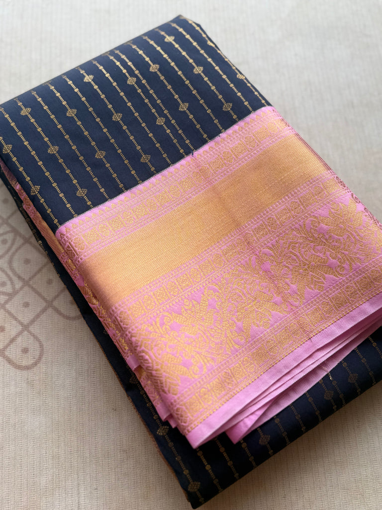 This elegant Semi Kanchi Silk Saree features a rich deep navy blue body adorned with delicate vertical zari stripes and dotted motifs, giving it a refined and graceful appearance. The shimmering zari lines run evenly throughout the body, creating a sophisticated texture that reflects traditional South Indian weaving aesthetics.