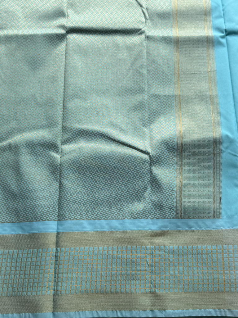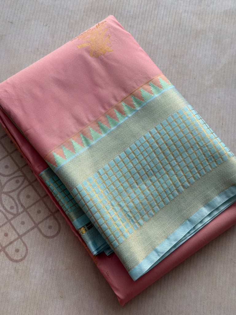 The saree is enhanced by a stunning contrast aqua green Kanchi border featuring traditional zari checkered patterns and classic temple-style detailing along the edge. The harmonious contrast between the soft pink body and the refreshing aqua border gives the saree a unique and elegant appeal. The richly woven zari pallu continues the checkered motif, adding depth and heritage craftsmanship to the drape. It comes with a matching blouse fabric with border, completing the traditional ensemble.
