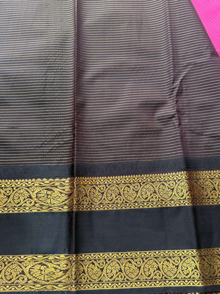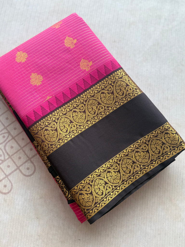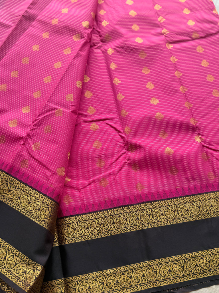 This graceful Semi Kanchi Silk Saree features a vibrant rani pink body adorned with fine zari lines running elegantly across the weave, creating a subtle striped texture. The body is further highlighted with traditional gold zari woven buttas, placed evenly to enhance the richness and classic appeal of the saree.