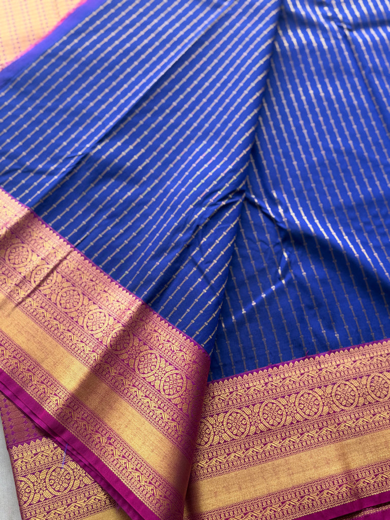 Tags: Semi Kanchi Silk Saree, Royal Blue Saree, Kanchi Border Saree, Zari Stripe Saree, Kanchipuram Style Saree, Festive Saree, Wedding Saree, Traditional Silk Saree, Zari Work Saree, South Indian Saree