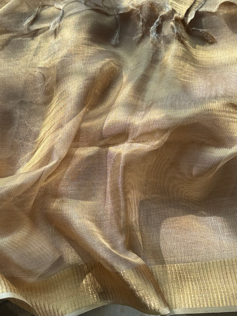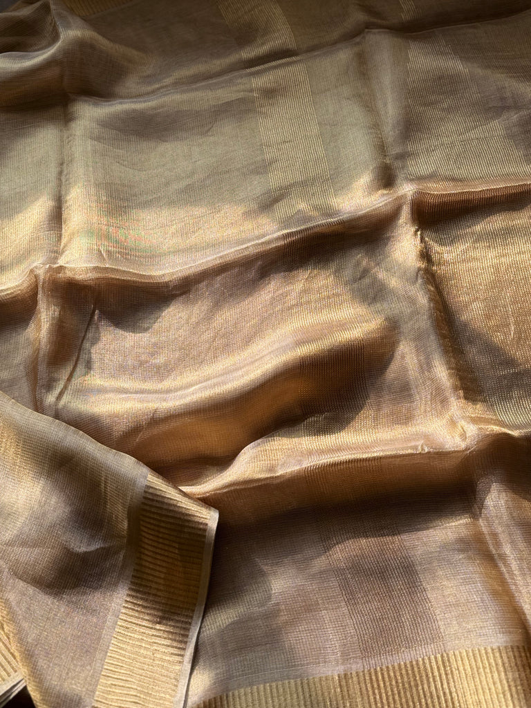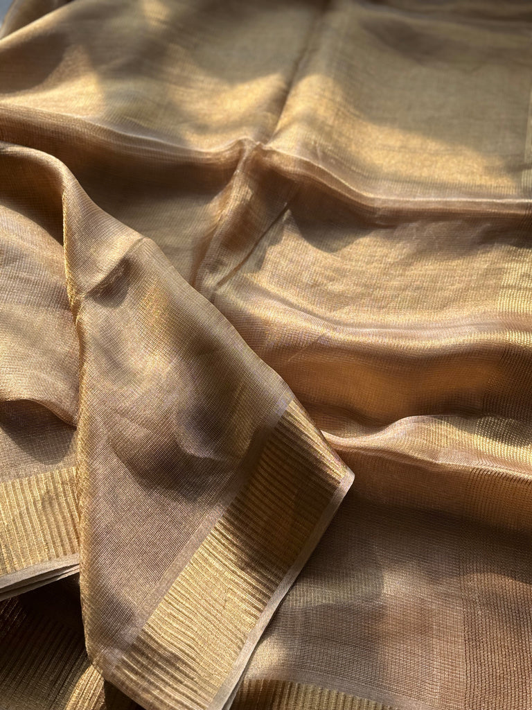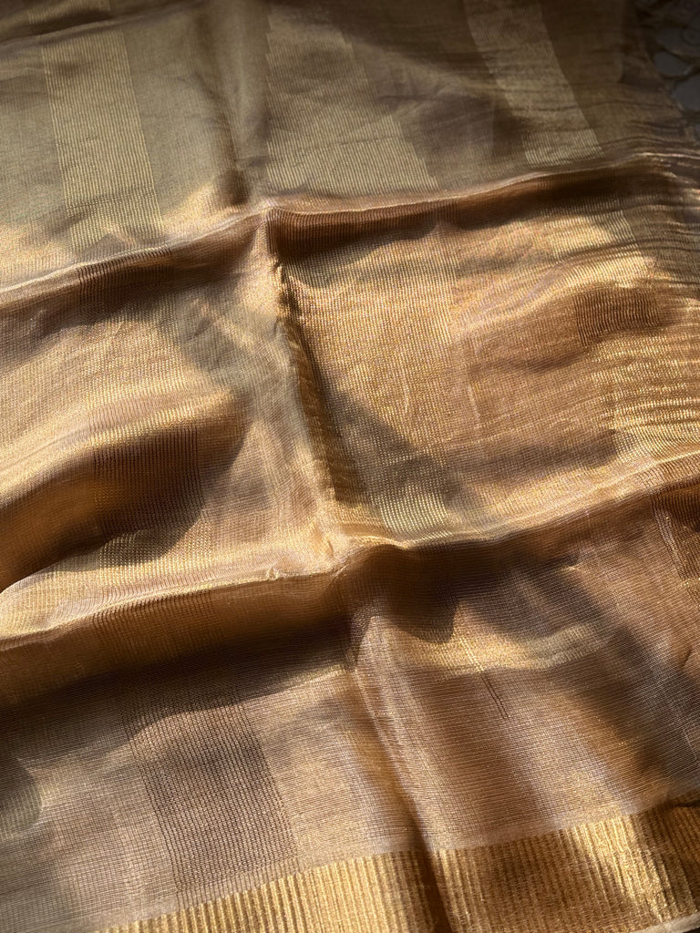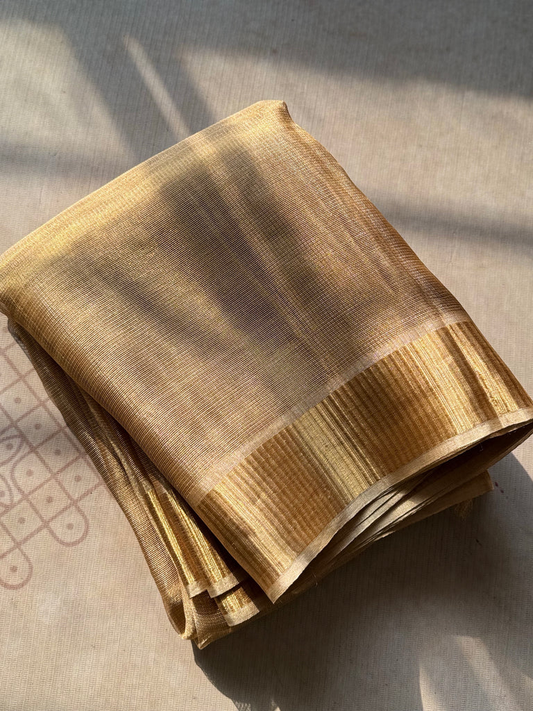 Crafted in pure tissue, this saree glows in a soft golden hue that feels effortlessly ethereal. Its plain, lustrous body drapes with quiet, refined elegance, while the bold woven border adds a striking minimalist frame to the delicate sheen. Traditional zari detailing graces the pallu, enriching the drape with timeless charm and heritage artistry. Lightweight yet luxurious, it beautifully blends subtle beauty with classic sophistication, and comes paired with a matching running blouse fabric for a complete ensemble.