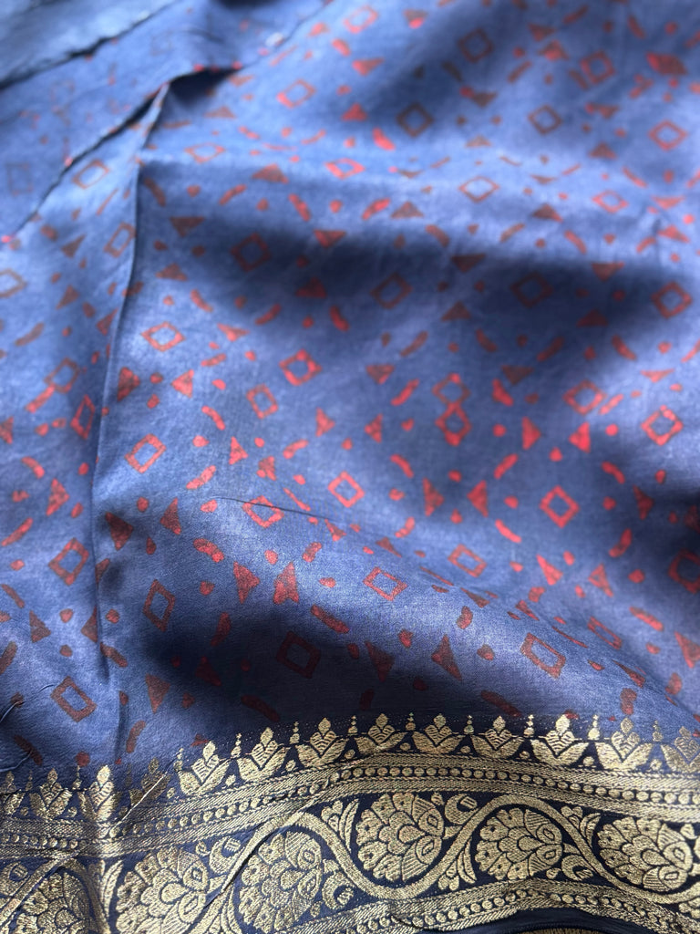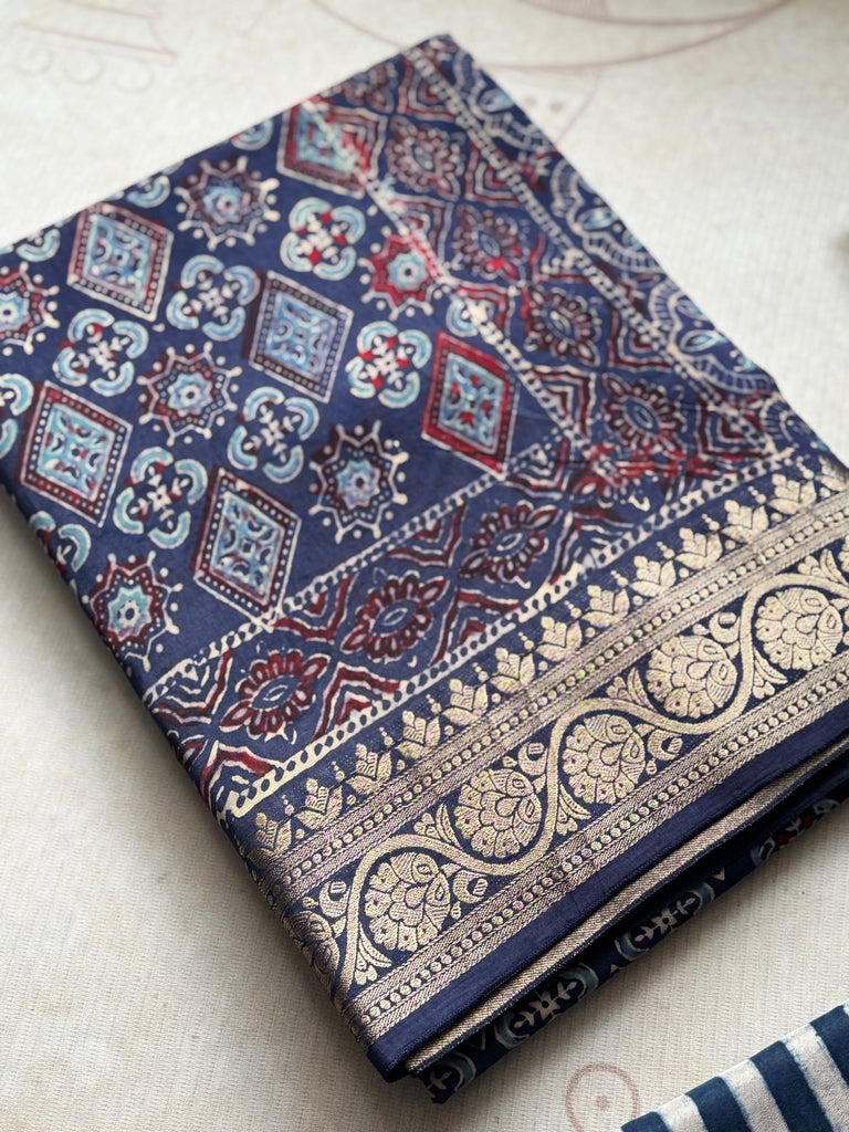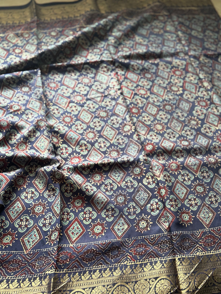 This Dola silk saree brings together traditional charm and contemporary style. It features beautiful Ajrak-inspired designs that stand out against the rich, smooth texture of Dola silk. The fabric’s natural sheen and graceful drape make it perfect for festive occasions, weddings, and elegant gatherings.