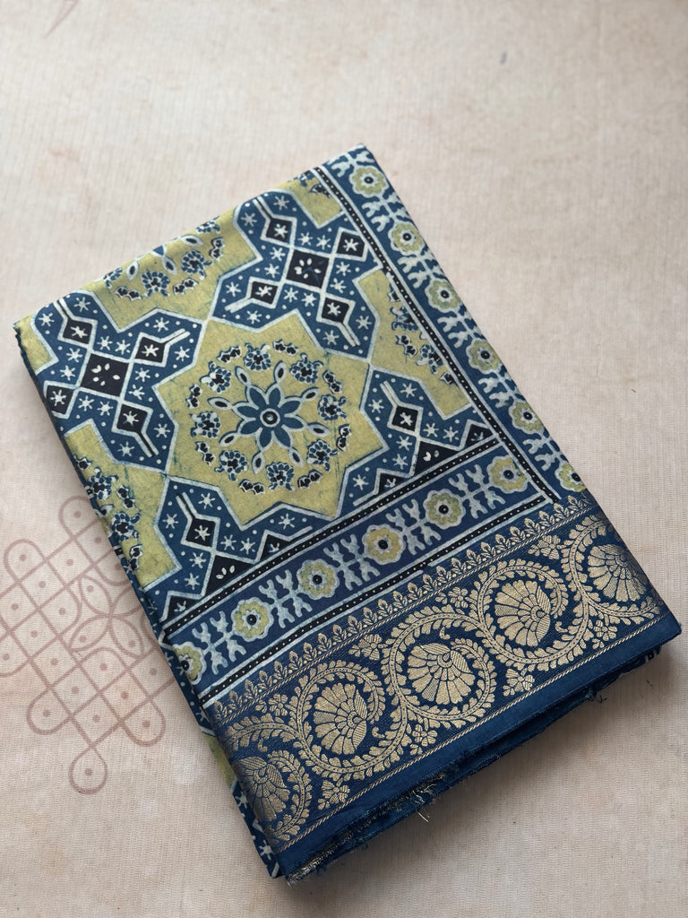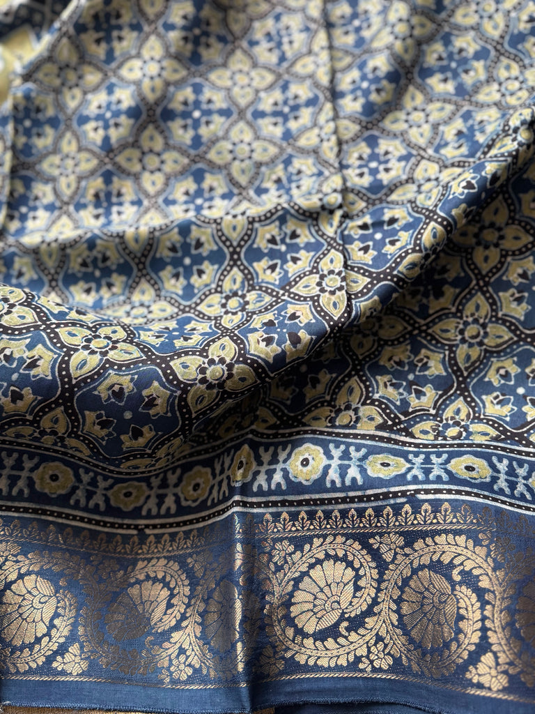 This luxe Dola silk saree brings together traditional charm and contemporary style. It features beautiful Ajrak-inspired designs that stand out against the rich, smooth texture of Dola silk. The fabric’s natural sheen and graceful drape make it perfect for festive occasions, weddings, and elegant gatherings.