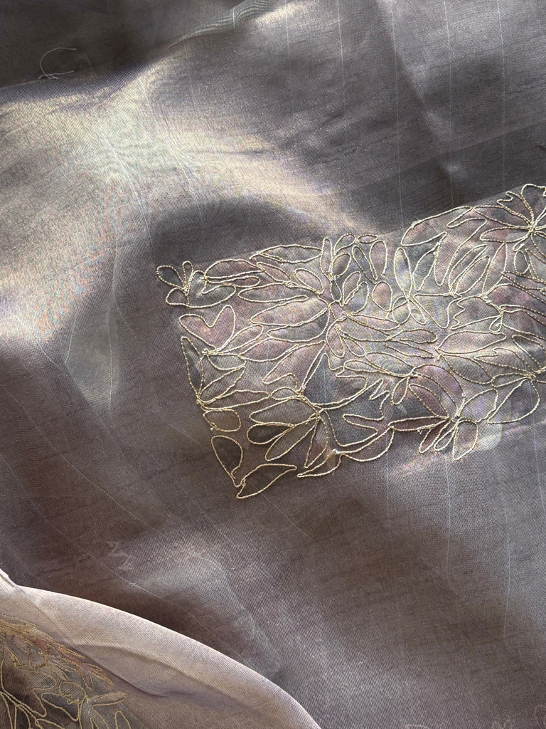 Elevate your wardrobe with this elegant Chanderi semi-silk saree, featuring a soft, muted lavender-grey base with a gentle sheen. The fabric is light, breathable, and drapes beautifully, making it ideal for daytime events, small gatherings, or festive occasions. Subtle vertical stripes run across the saree, adding texture and depth, while delicate floral and leaf motifs are embroidered in soft hues of peach, rose, and gold, giving it a refined yet contemporary look.