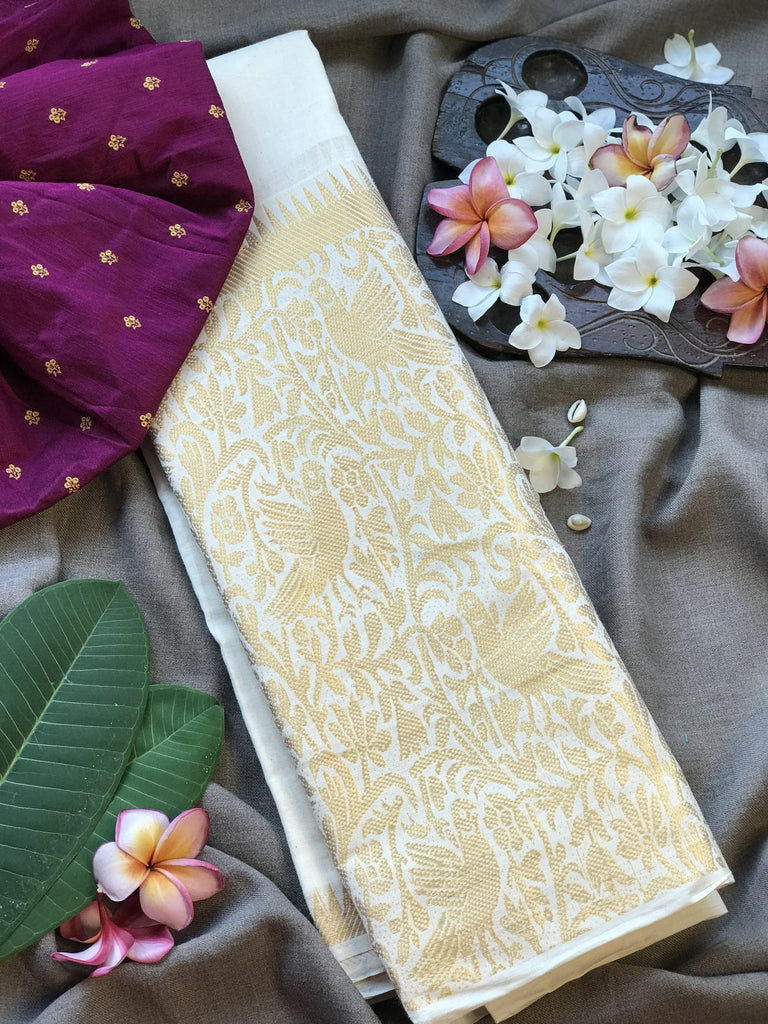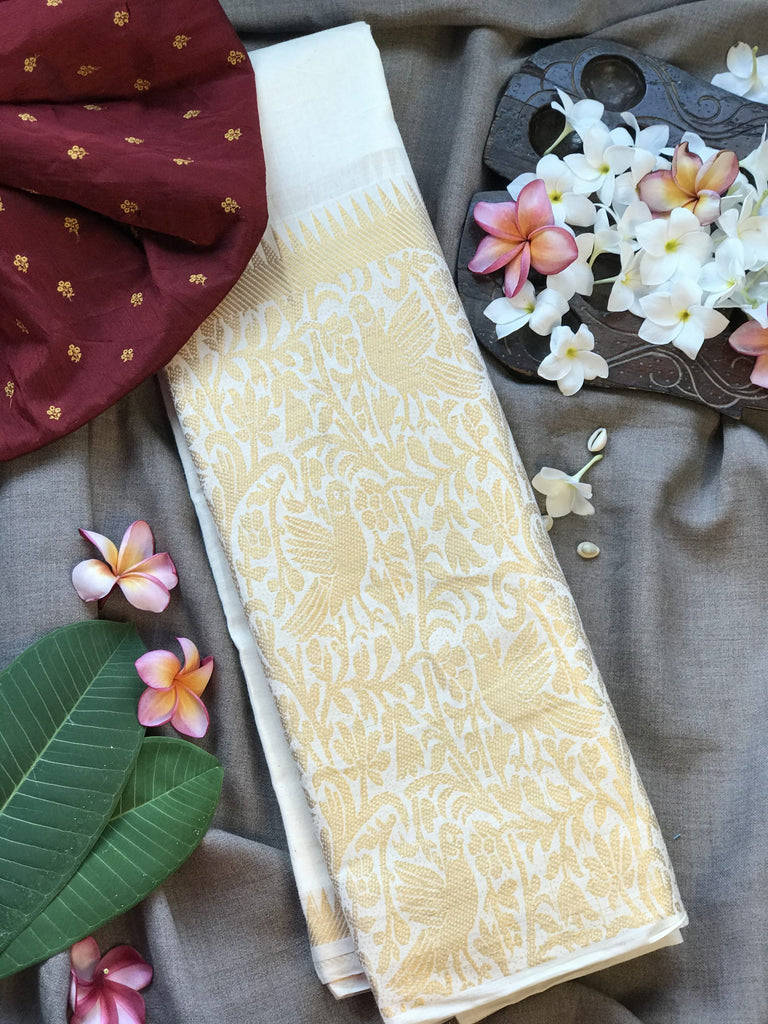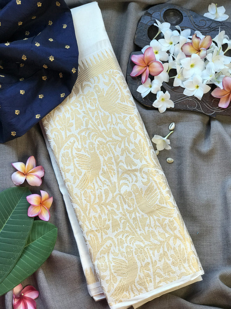 Kaashi ~ Onam Collection ~ An exclusive Virupa range of Pure cotton Vanasingari in a Beautiful weave inspired from the classic Kanchivaram pattern of Birds & Forest filled with Zari & etched with Temple (Korvai) Border and Pallu in beautiful Off-white & Gold shades.