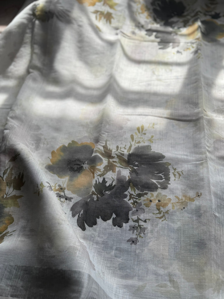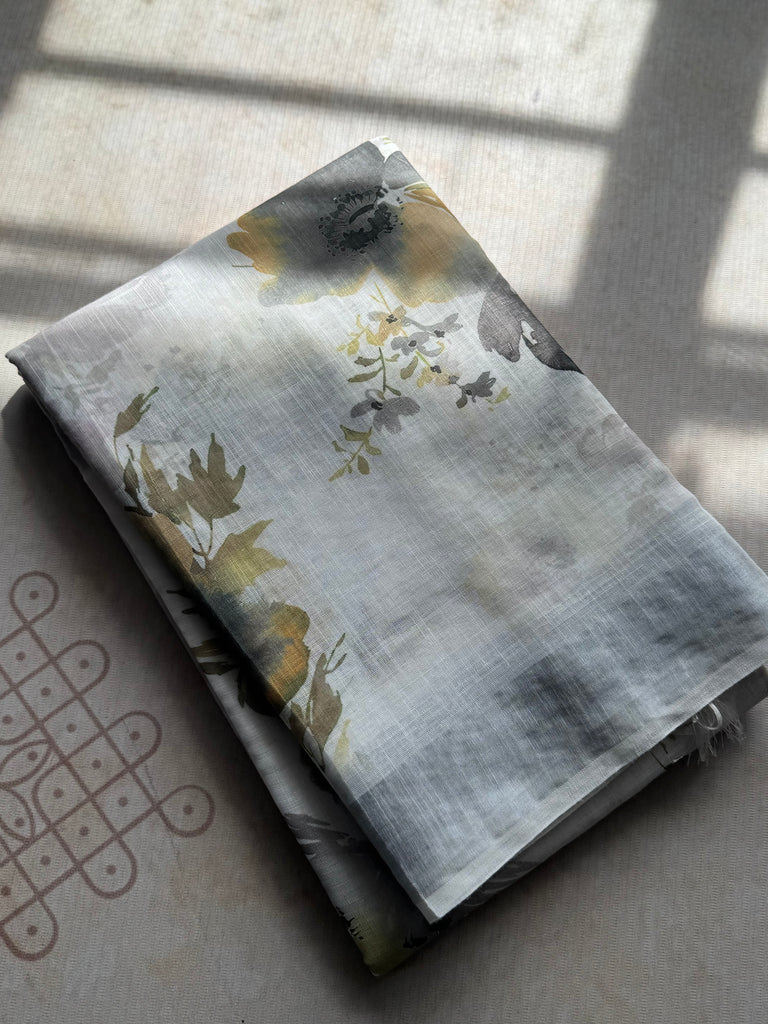 Grace meets comfort in this stunning linen cotton saree, adorned with an exquisite silver border that adds a touch of understated glamour. The saree features delicate floral prints spread gracefully across the body, offering a refreshing and timeless aesthetic. Paired with a matching hakoba blouse, this ensemble blends tradition with contemporary charm—perfect for both casual elegance and festive occasions.