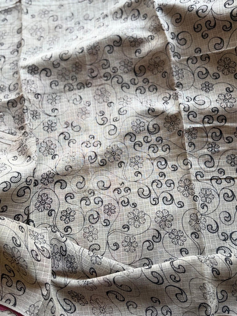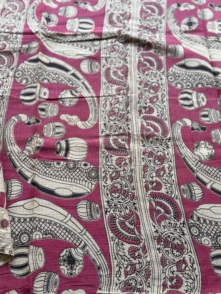 Celebrate timeless artistry with this exquisite Kota Cotton Kalamkari Saree, featuring a rich deep magenta/pink base adorned with intricate off-white Kalamkari-inspired prints. The saree showcases elegant floral vines across the body, beautifully complemented by a striking pallu that highlights graceful peacock motifs—symbolizing beauty and heritage.