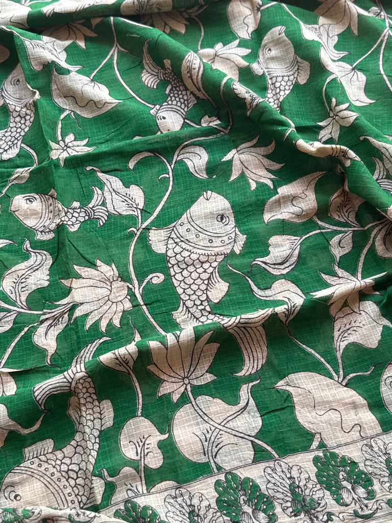 Celebrate timeless elegance with this stunning Kota Cotton Kalamkari Saree, available in a rich dual-tone palette of deep charcoal grey and vibrant emerald green. The body is adorned with intricate floral vines and traditional fish motifs, beautifully rendered in off-white Kalamkari-inspired prints that create a striking contrast against the base.