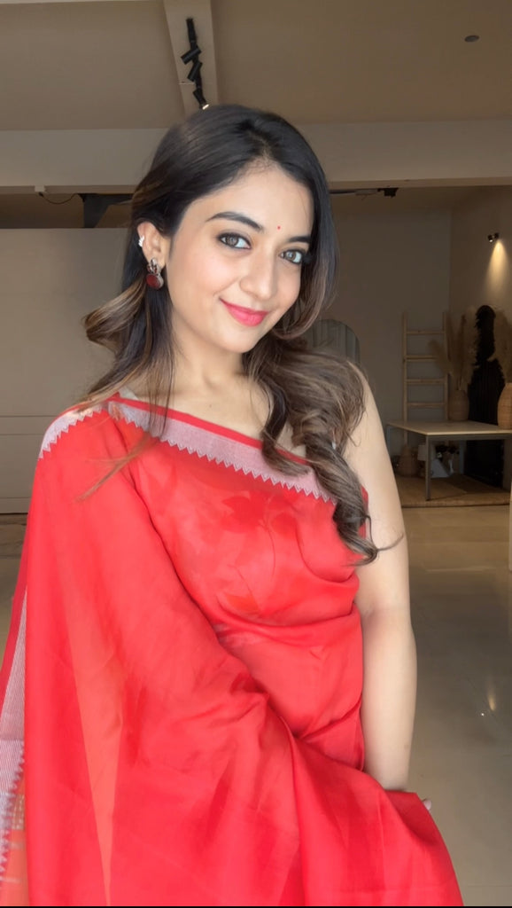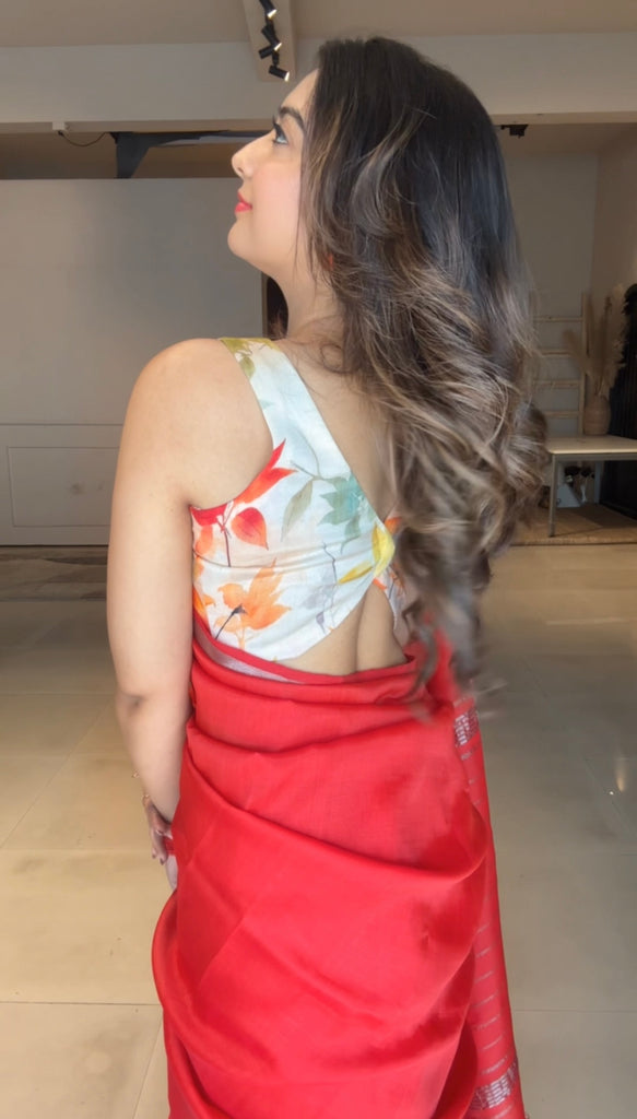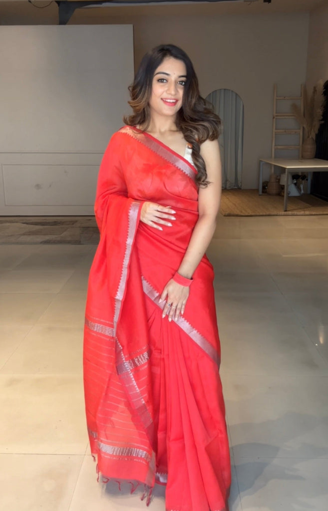 The Mangalgiri Semi Silk Saree is a beautiful and elegant choice for any occasion. This saree features a Red color with a small silver zari border and a contrasted color floral blouse. The semi silk material offers a comfortable and lightweight feel, making it perfect for all-day wear. Elevate your style with this timeless and traditional saree.