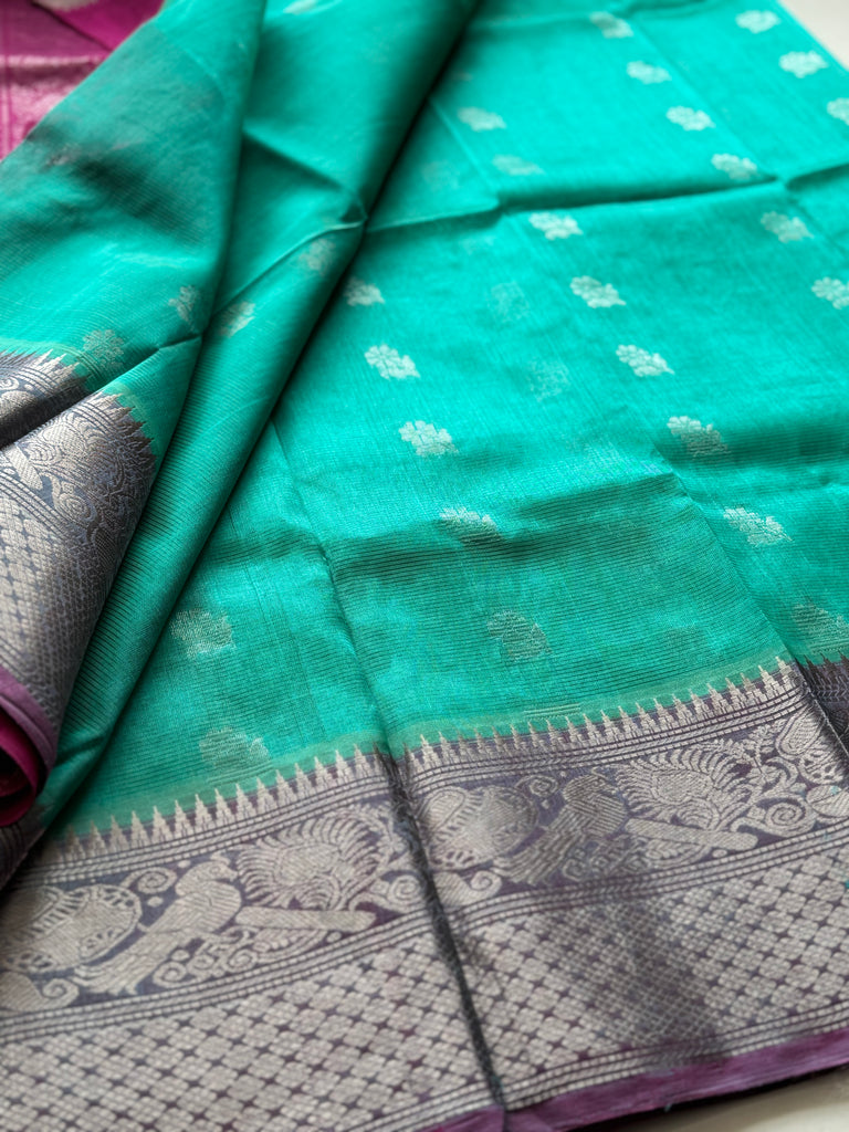 Get ready to add a touch of elegance to your wardrobe with our Pure Mangalgiri Silk Cotton Collection. Handwoven with intricate silver zari detailing, this ocean bsaree will make you stand out in any occasion. Explore our new collection today.Comes with One Meter Running Blouse Fabric.