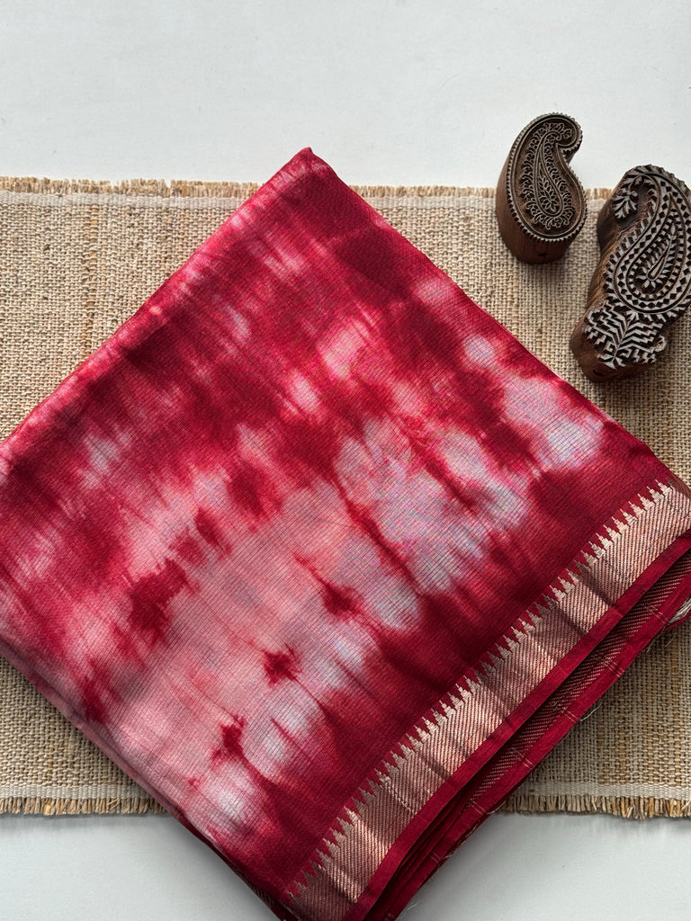 This Mangalgiri silk cotton saree features a unique shibori technique, digitally printed for a modern touch. Crafted with precision, it offers a comfortable and trendy option for traditional occasions. The perfect blend of tradition and technology, this saree is sure to make a statement.