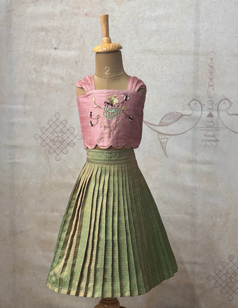 This Brocade Crop Top and Skirt is a stunning combination of traditional and modern elements. The detailed aari work, featuring bees and flowers, adds a touch of elegance to the crop top. The brocade fabric used for both the top and skirt ensures a luxurious feel, making it a unique and beautiful addition to any wardrobe.