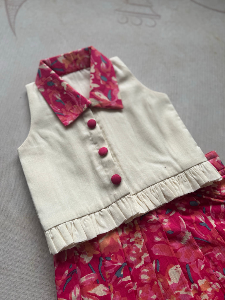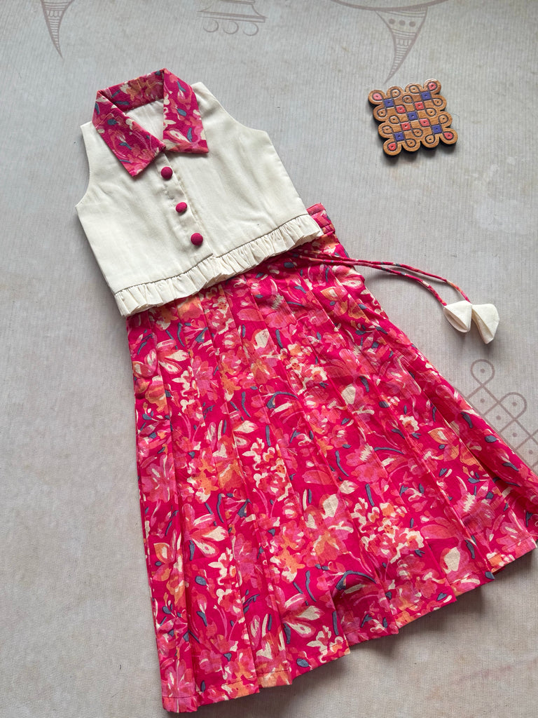 A chic crop top and skirt set designed for comfort and style. The crop top is made from soft cotton fabric, featuring elegant collared, sleeveless and  ruffle edges that add a fresh, feminine touch. It pairs beautifully with the matching floral cotton skirt, offering a breathable and lightweight feel—perfect for warm days or laid-back outings. This set effortlessly combines simplicity with charm.