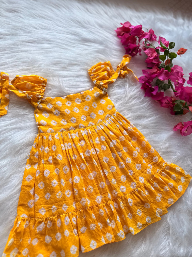Introducing the Zia Soft Cotton Dress, designed for kids with a playful and stylish tie dyed bandhini design. Made with soft cotton, it features unique ranglan cap sleeves that can be tied into a bow and border with delicate pleats and frills. Add a touch of charm and comfort to your child's wardrobe.