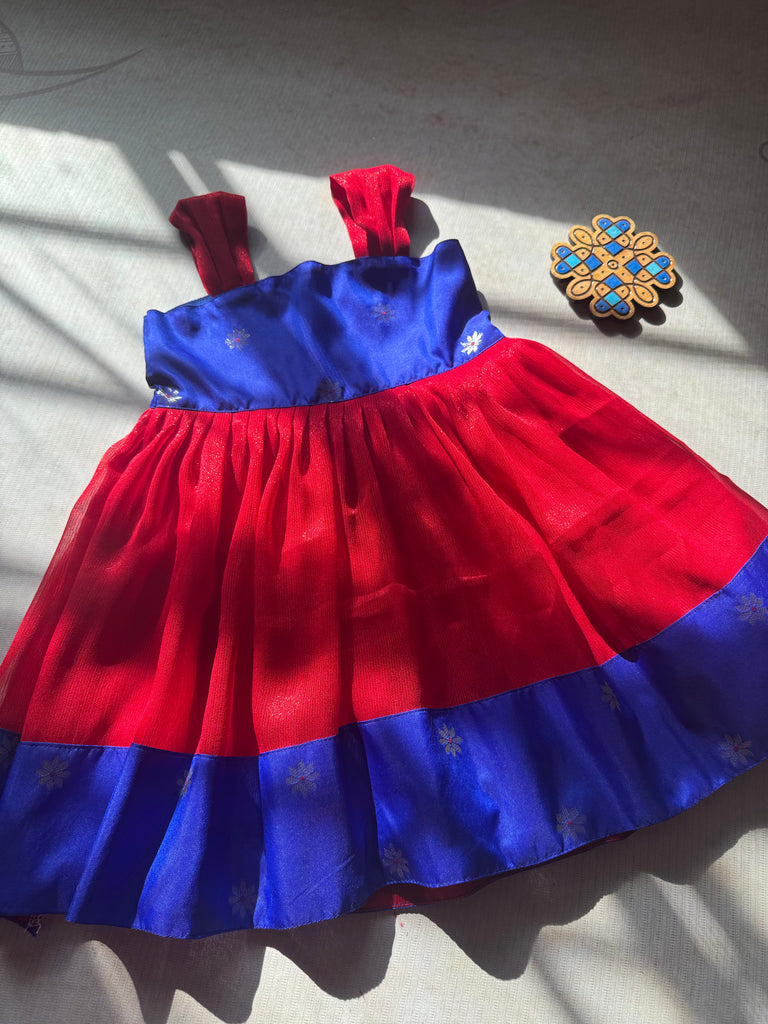 Enhance your child's wardrobe with our stunning Kids Paithani Dress. The broad strap and beautiful Paithani border add an elegant touch to any look. Your little one will feel like a doll and look adorable. Don't miss out on this must-have piece!