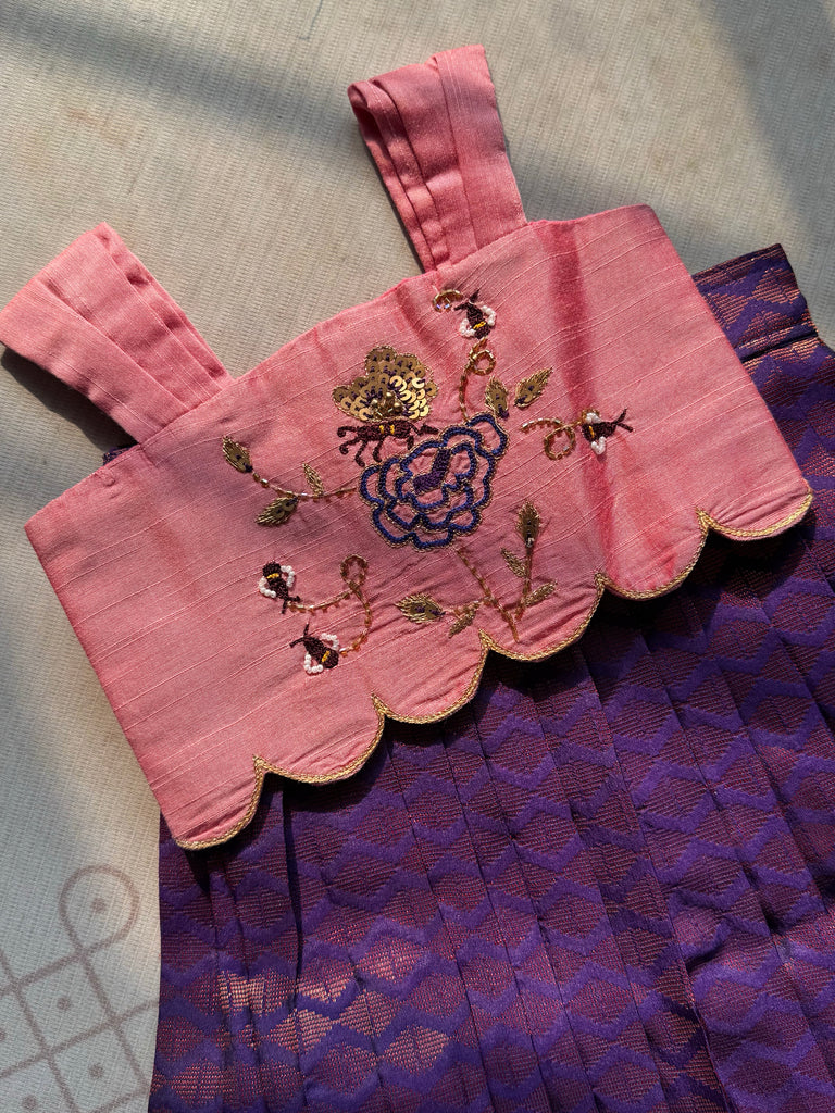 This Brocade Crop Top and Skirt is a stunning combination of traditional and modern elements. The detailed aari work, featuring bees and flowers, adds a touch of elegance to the crop top. The brocade fabric used for both the top and skirt ensures a luxurious feel, making it a unique and beautiful addition to any wardrobe.
