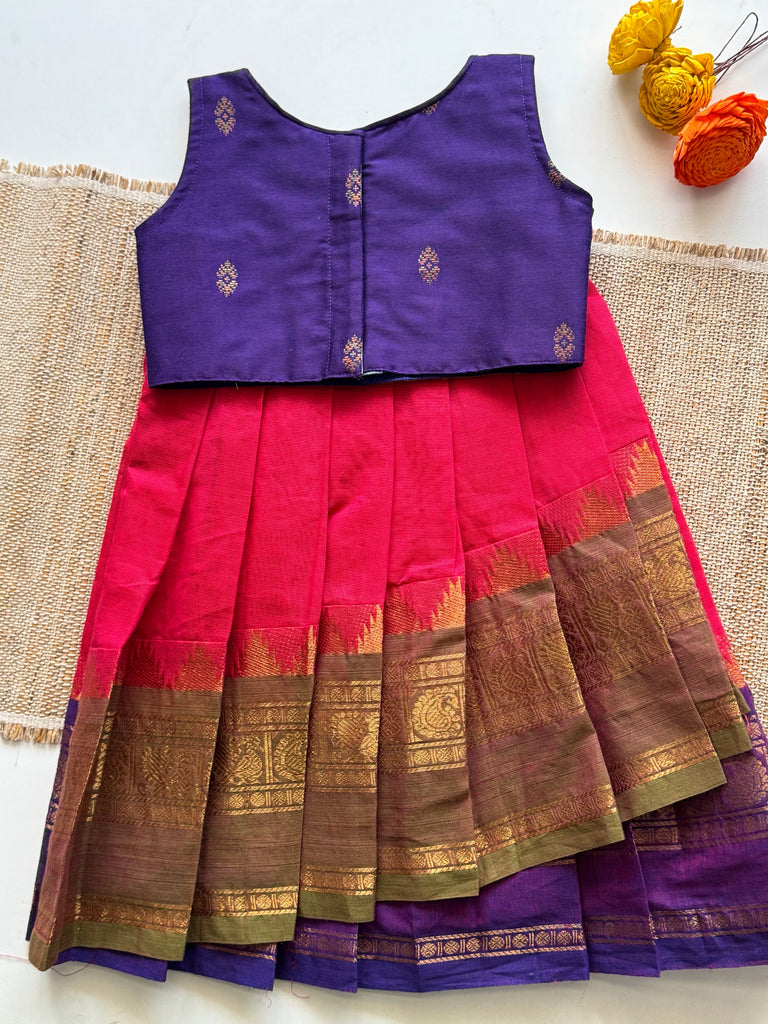 This Chettinad cotton overlapped Skirt with Crop top is exquisitely designed and tailored to perfection. With its traditional yet modern look, it is perfect for any occasion or celebration. Crafted from high-quality cotton, it offers both comfort and style. Add this to your kid's wardrobe for a beautiful and versatile outfit option.