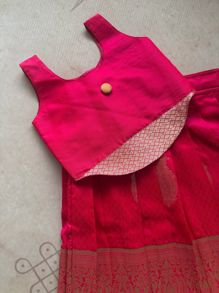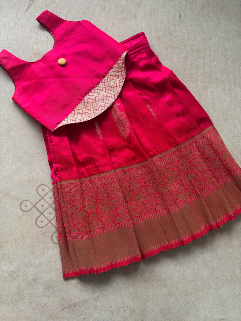 Crafted with traditional zari checkered temple borders, the Sita Corset Top and Skirt exude a classic and elegant look. The corset top cinches your waist for a flattering silhouette, while the skirt flows gracefully for a comfortable fit. Perfect for special occasions, this ensemble will make you stand out with its unique design and impeccable quality.