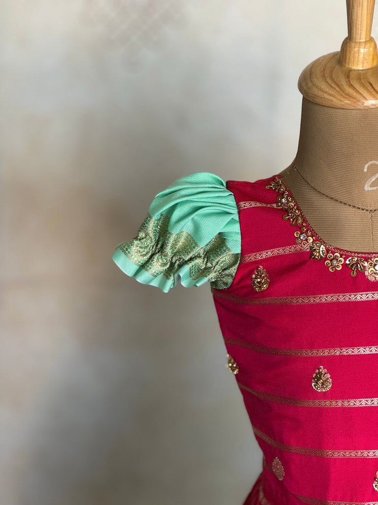 Tags: Kids Corset Set, Aari Work Dress, Pink Mint Kids Outfit, Festive Kids Wear, Zari Skirt Set, Ethnic Kids Clothing, Pleated Skirt Set, Traditional Kids Outfit, Studio Virupa, Wedding Kids Wear