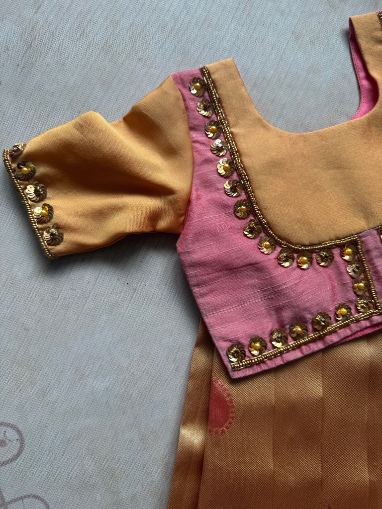 Paired with it is a semi silk skirt, featuring delicate golden buttas that shimmer with every movement. The look is elevated with a contrasting traditional border woven in zari, adding richness and depth to the ensemble. Perfect for celebrations, weddings, or cultural gatherings, this set radiates sophistication while keeping comfort at its core.