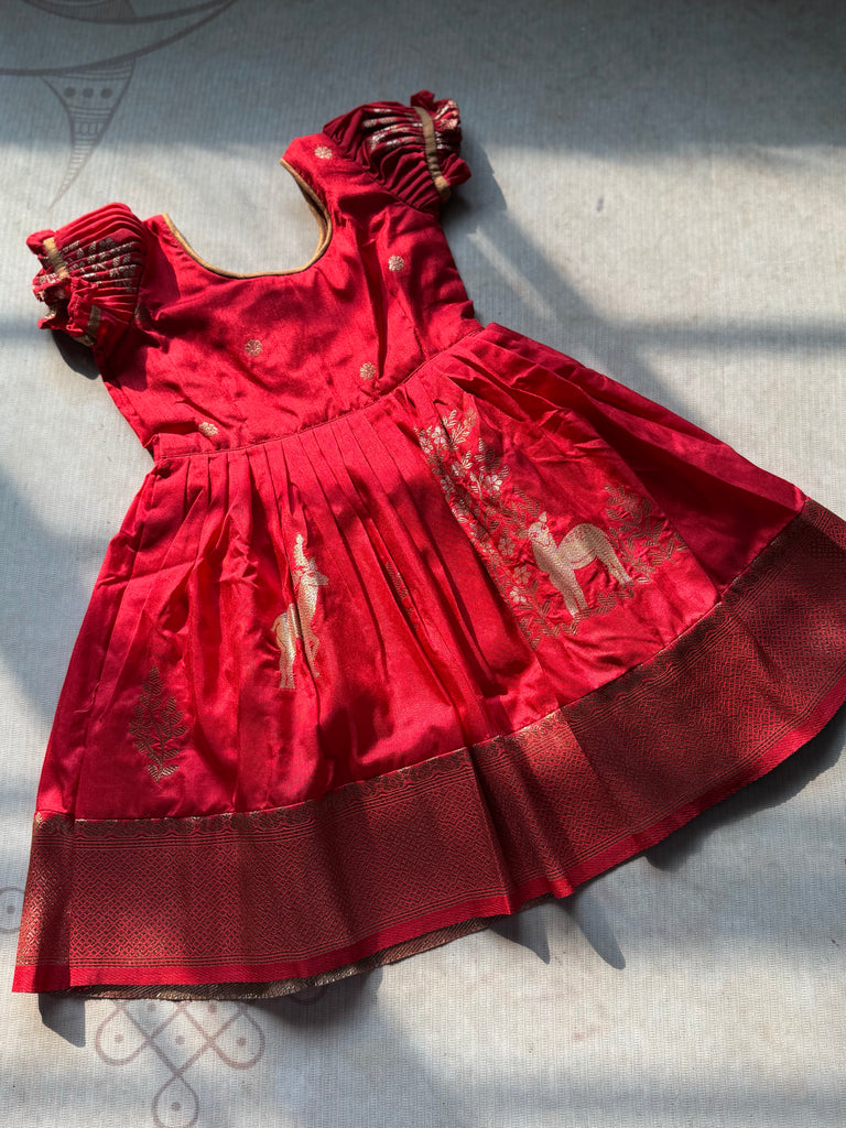 A beautiful checked Chettinad Cotton kids frock in purple and white with zari detailed Border.