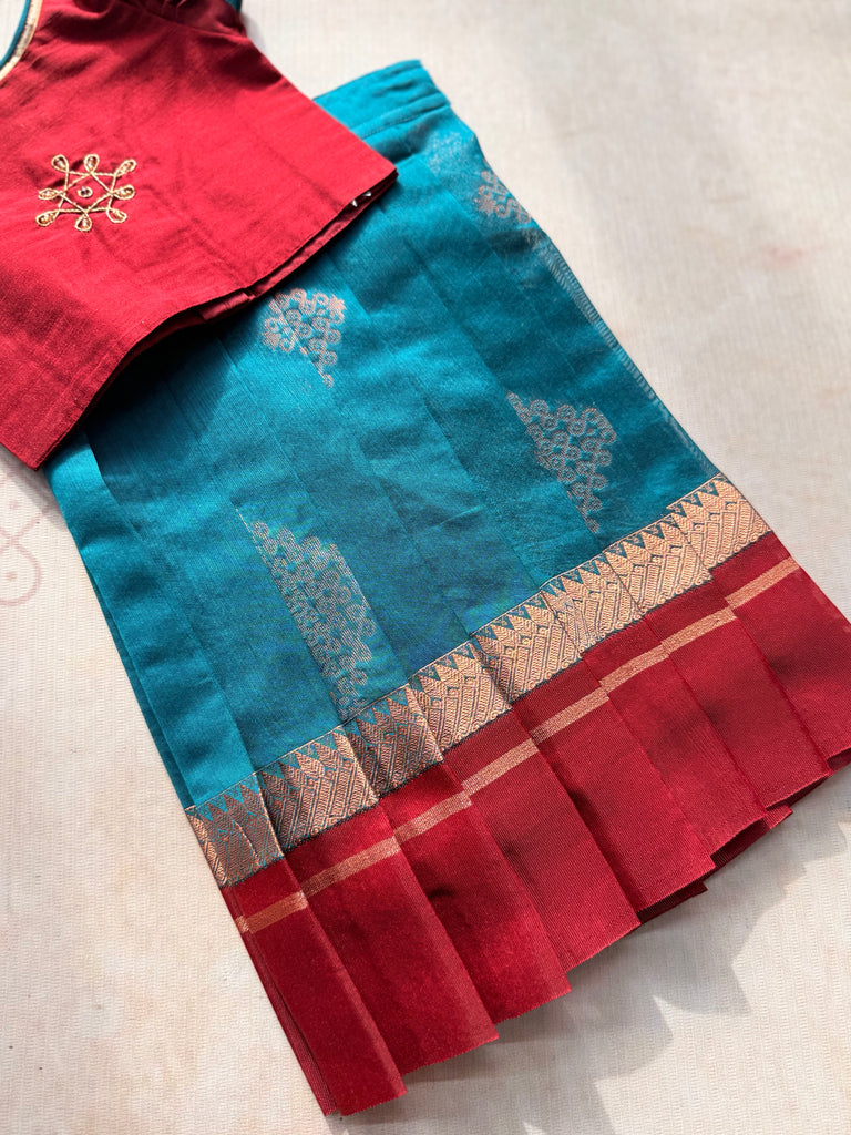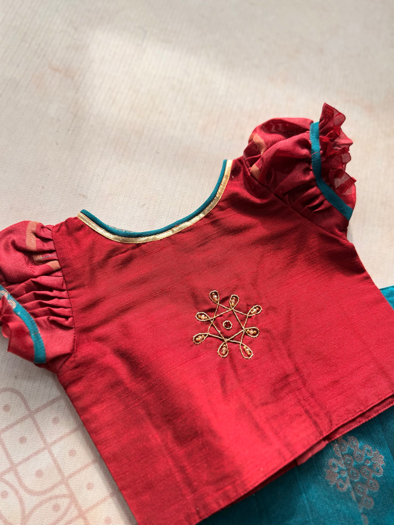 Step into effortless festive elegance with this Silk Cotton Crop Top and Skirt set, designed to keep tradition chic and contemporary. The raw silk crop top features trendy puff sleeves and is highlighted with a minimal rangoli-inspired motif, beautifully handcrafted in Aari embroidery. Subtle yet striking, it’s the perfect blend of heritage detail with a modern twist.
